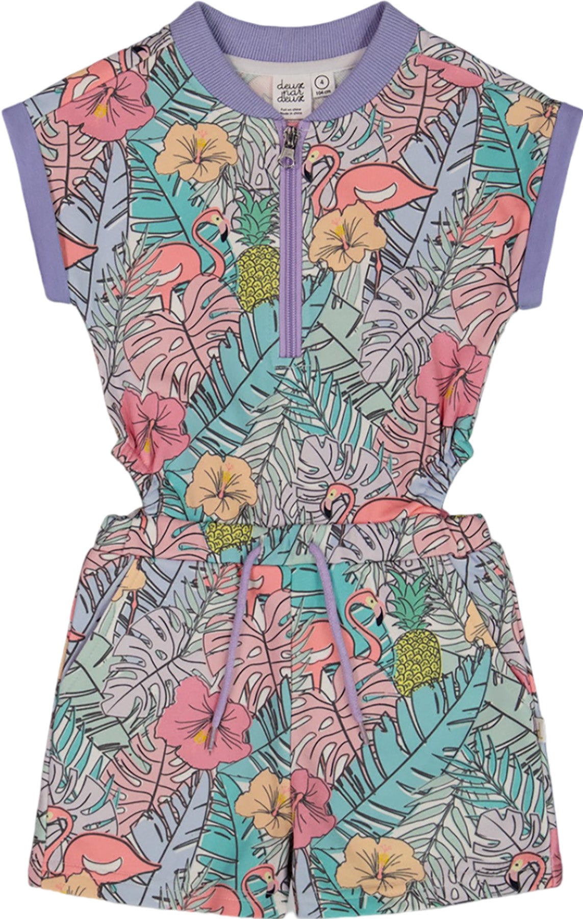 Cutout sides add a playful touch to our colorful Printed French Terry Romper Lilac Tropical and Pink Flamingos. This sporty one-piece features short sleeves, a round rib knit collar with a half zipper closure, and a comfortable drawstring elastic waist. Cutouts at each hip, solid lilac trim, and slant pockets add the perfect finishing touches!