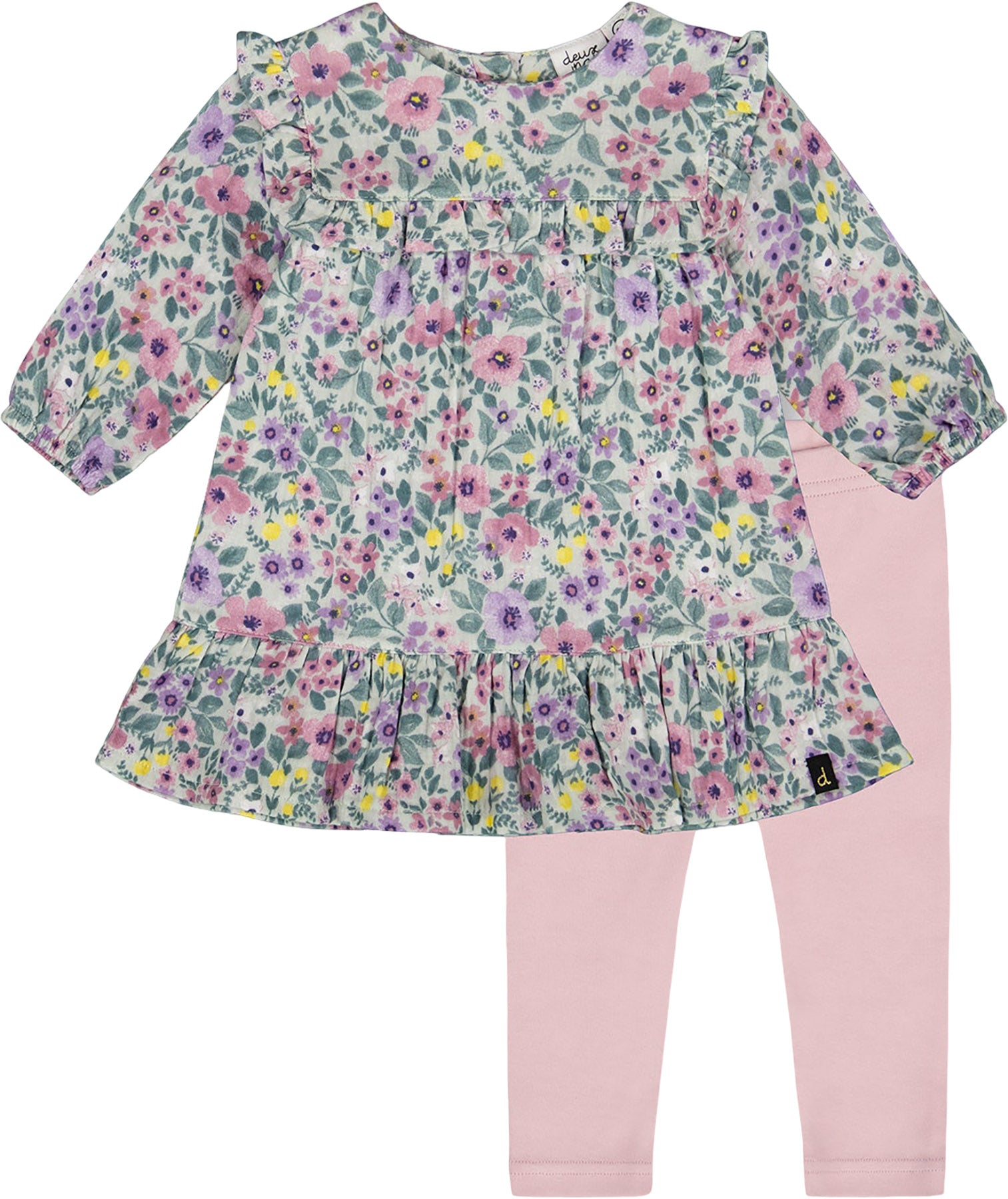 A charming piece from our Winter Tales collection, our Printed Muslin Sage Floral Dress and Solid Leggings Set brings comfort and elegance to any occasion. The smock features a soft muslin fabric with a delicate allover floral print, long sleeves, ruffled details, and a flowing silhouette. Paired with ultra-comfy interlock neutral purple leggings, this set is both stylish and perfect for everyday adventures.