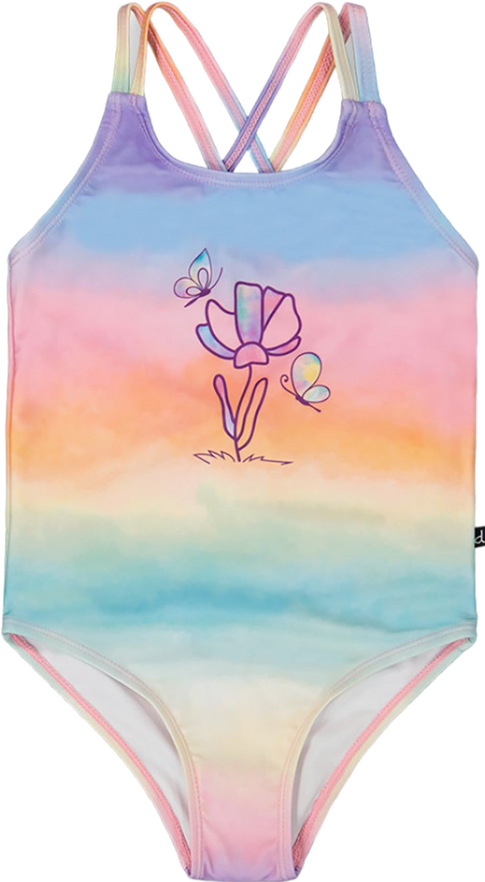 Our Printed One-Piece Swimsuit Flowers on Multicolored Background is made for the girl who loves the sun, sand, and surf! This colorful swimsuit features a comfortable one-piece silhouette with a scoop neckline, double straps that crisscross in back, and a UPF 50+ UV protection rating to shield her skin from the sun.