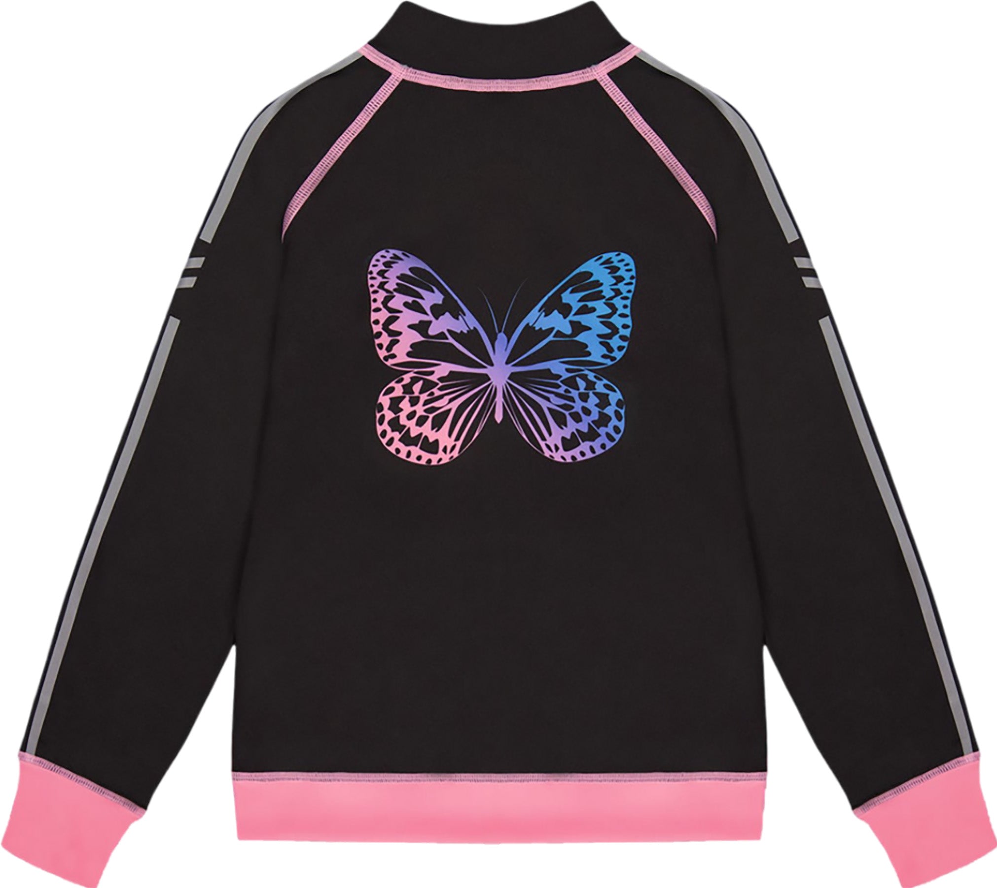 Our Printed Reversible Full Zip Athletic Cardigan Pink, Blue and Butterflies offers two completely different looks in one design! In recycled fabric with long raglan sleeves and a zip front closure, this jacket coordinates perfectly with every top and bottom in our Athletic collection. One side features a bold allover print, while the other side offers a solid look with sleeve stripes and a multicolored butterfly on the back.