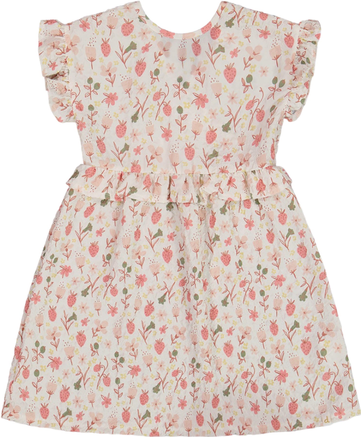 An allover strawberry and floral print makes our Printed Seersucker Dress with Frill Pink Flowers on Cream Background perfect for any girly girl. Simply charming in an A-line silhouette with ruffle accents, this casual dress features short sleeves with frills, a round neckline, and little frills that encircle the waist.