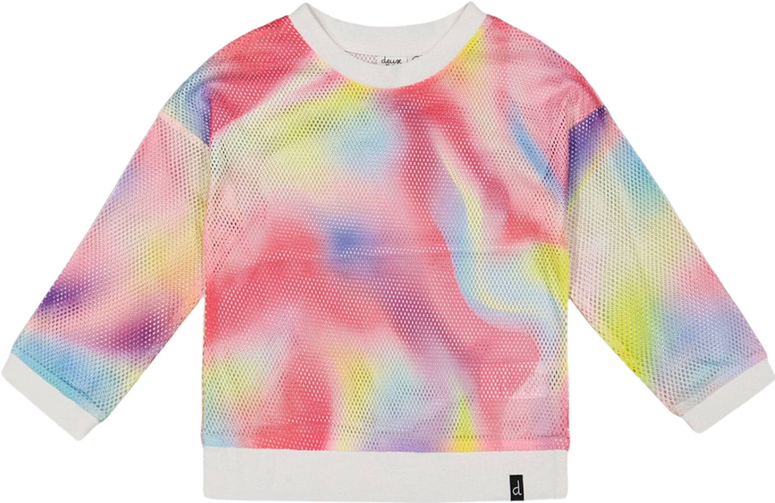 Lightweight mesh fabric makes our Long Sleeve Mesh Top Rainbow Print a stylish way to layer up on a spring or summer day. Detailed with long sleeves and a crew neckline, this pullover features an allover multicolor print with contrast solid binding at the neck, cuffs and hem.