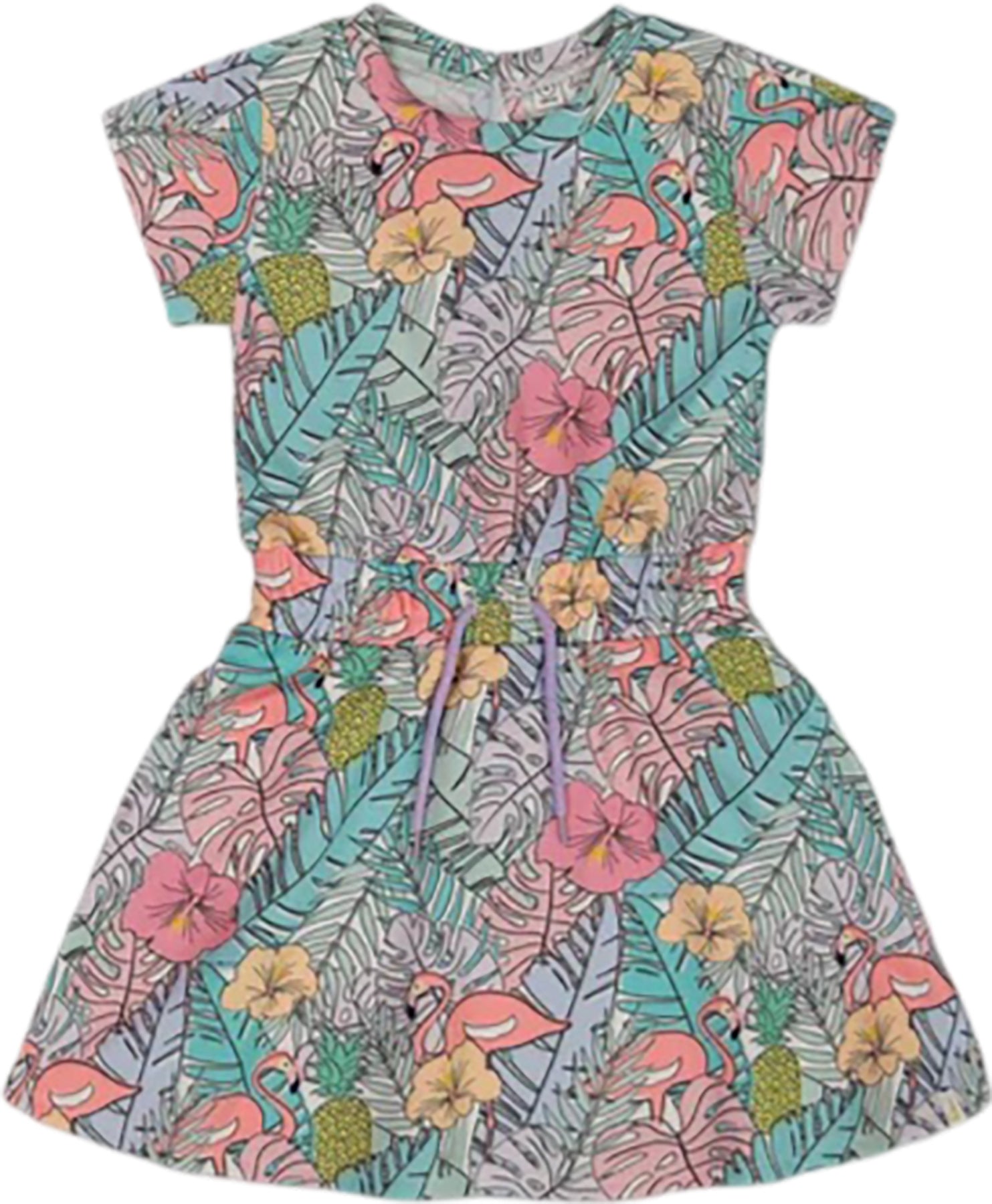 Our Printed French Terry Dress Lilac Tropical and Pink Flamingos is a must-have for warm spring and summer days! In sweatshirt fabric that makes it oh-so-comfortable to wear, this casual dress features short sleeves, a round neckline, a cutout back, and a flared A-line skirt with a drawstring elastic waistband.