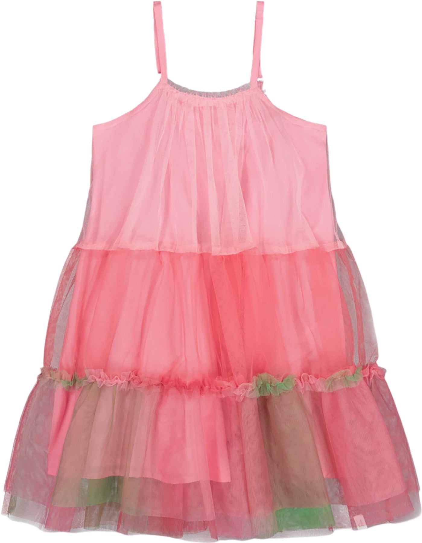 A sheer overlay lends texture and playfulness to our Sleeveless Color Block Tulle Dress Pink and Green. This darling dress features a sleeveless bodice with slender straps, a scoop neckline, and a tiered mesh overlay with little ruffles and a bold gradient print. It's perfect for the little one with an ultra-girly sense of style!