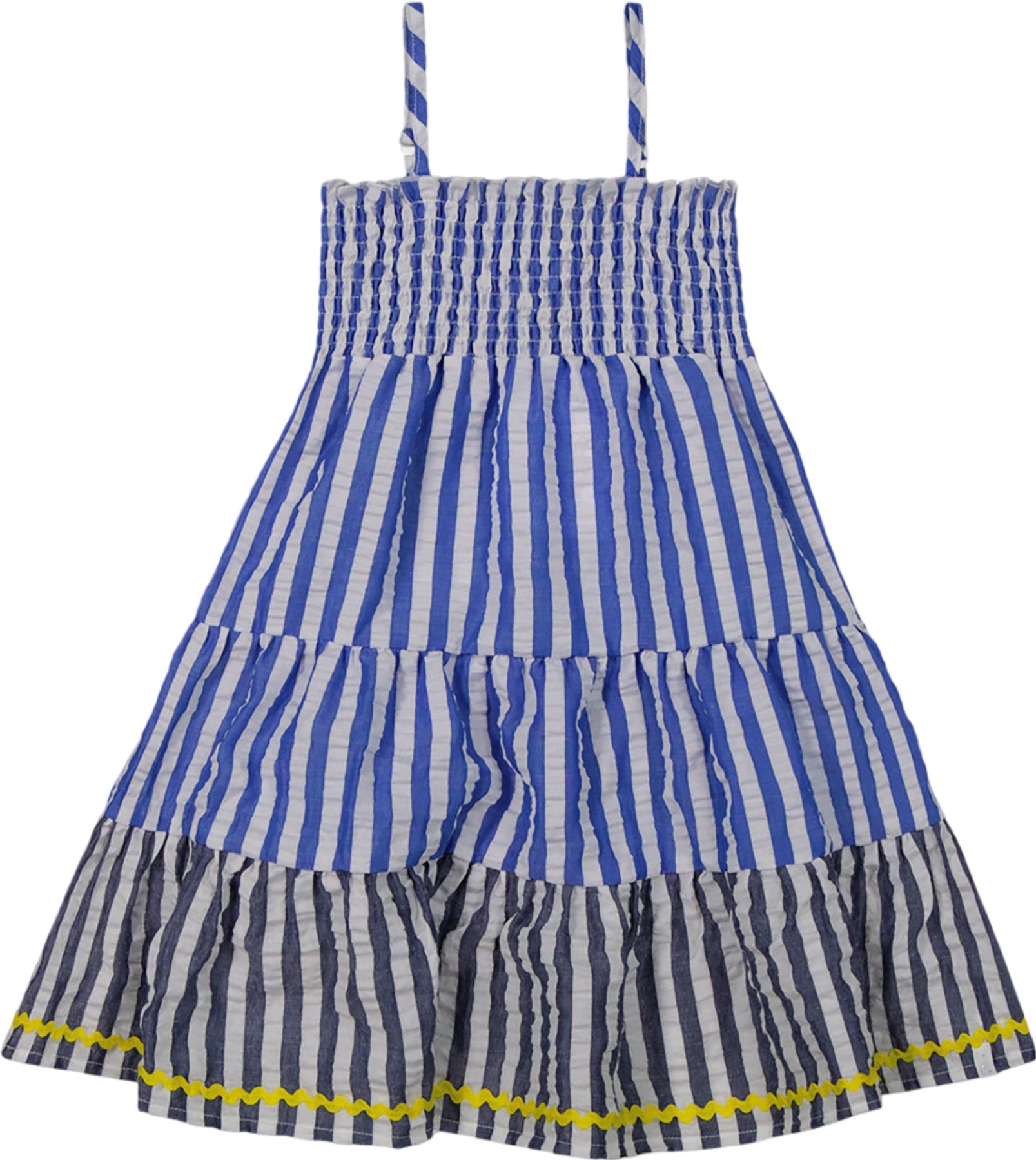 Casual and comfortable, she's sure to adore our Smocked Seersucker Peasant Dress Blue and White Striped. This adorable spring and summer dress features slender straps, a stretchy smocked bodice with a square neckline, and a tiered A-line skirt. Contrast color stripes and pop color ricrac trim make it oh-so-sweet!
