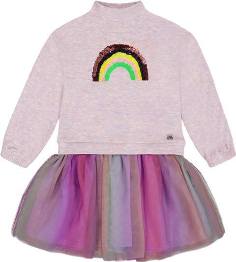 With a sweatshirt bodice and flared tulle skirt, this dress is sure to become her favorite new look! Our Super Soft Sweatshirt Dress with Rainbow Tulle Skirt features a long sleeve bodice with dropped shoulders, a crew neckline, elastic cuffs and a sequin rainbow on the chest. The skirt adds contrast and vibrant color with vertical rainbow stripes in a twirl-worthy silhouette.