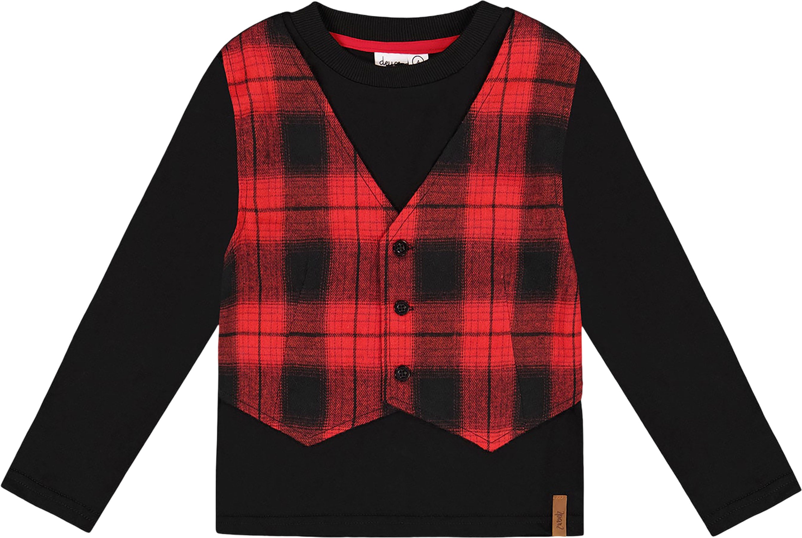 Our T-Shirt With Plaid Vest Red and Black offers a smart layered look without the fuss. Made from soft jersey with a woven plaid overlay, this stylish top features long sleeves, a crew neckline, and a mock buttoned vest sewn onto the front. It’s the perfect mix of comfort and charm for festive gatherings or dress-up days.