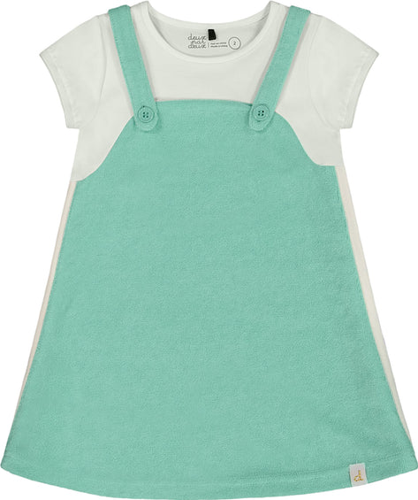 In our Terry Cloth Dress Turquoise and Off-White, she'll be perfectly dressed for a day of play! This sporty little dress features short sleeves, a round neckline, striped rib knit trim down each side, and a shift silhouette that makes it super comfortable to wear. Terry cloth straps with buttons make it appear as though she's wearing a jumper over a tee, but it's all one easy-to-wear piece.