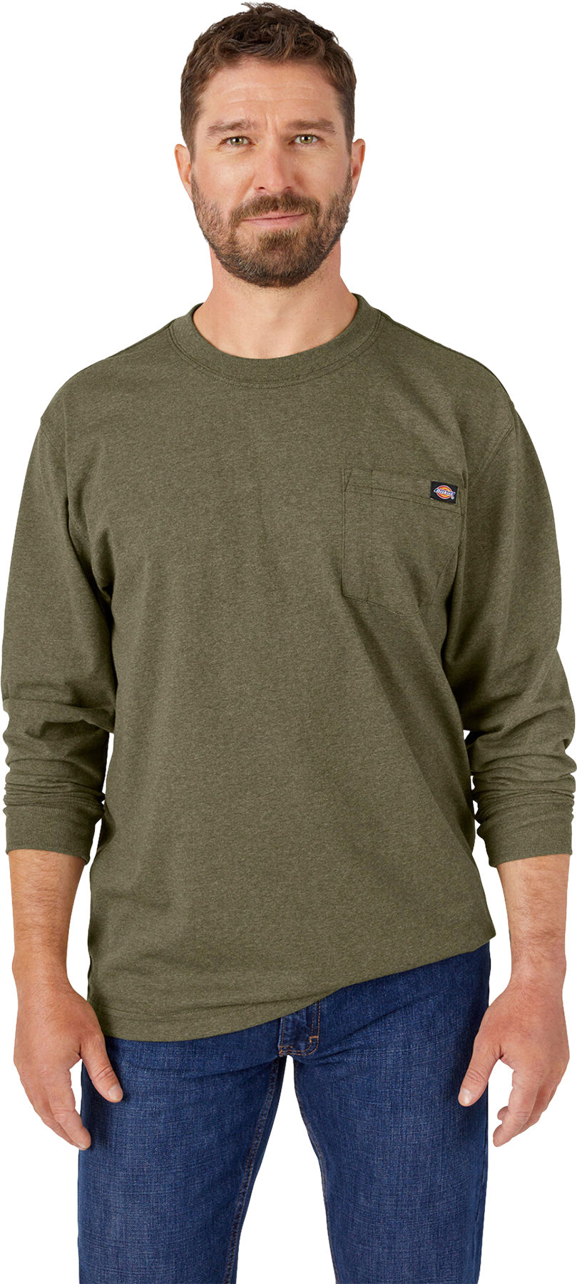 This Men's Heavyweight Heathered Long Sleeve Pocket T-Shirt accompanies you while you get the job done. Enjoy the comfort of a jersey knit with a roomy fit and long tail. Enjoy the convenience of a chest pocket as you go about your workday. Whether you wear this alone or as a base layer on a cold day, you'll feel comfortable, thanks to the tagless back label design and the sturdy reinforced shoulder and neck seams. The heathered coloring and Dickies logo add a dash of style to this tee.