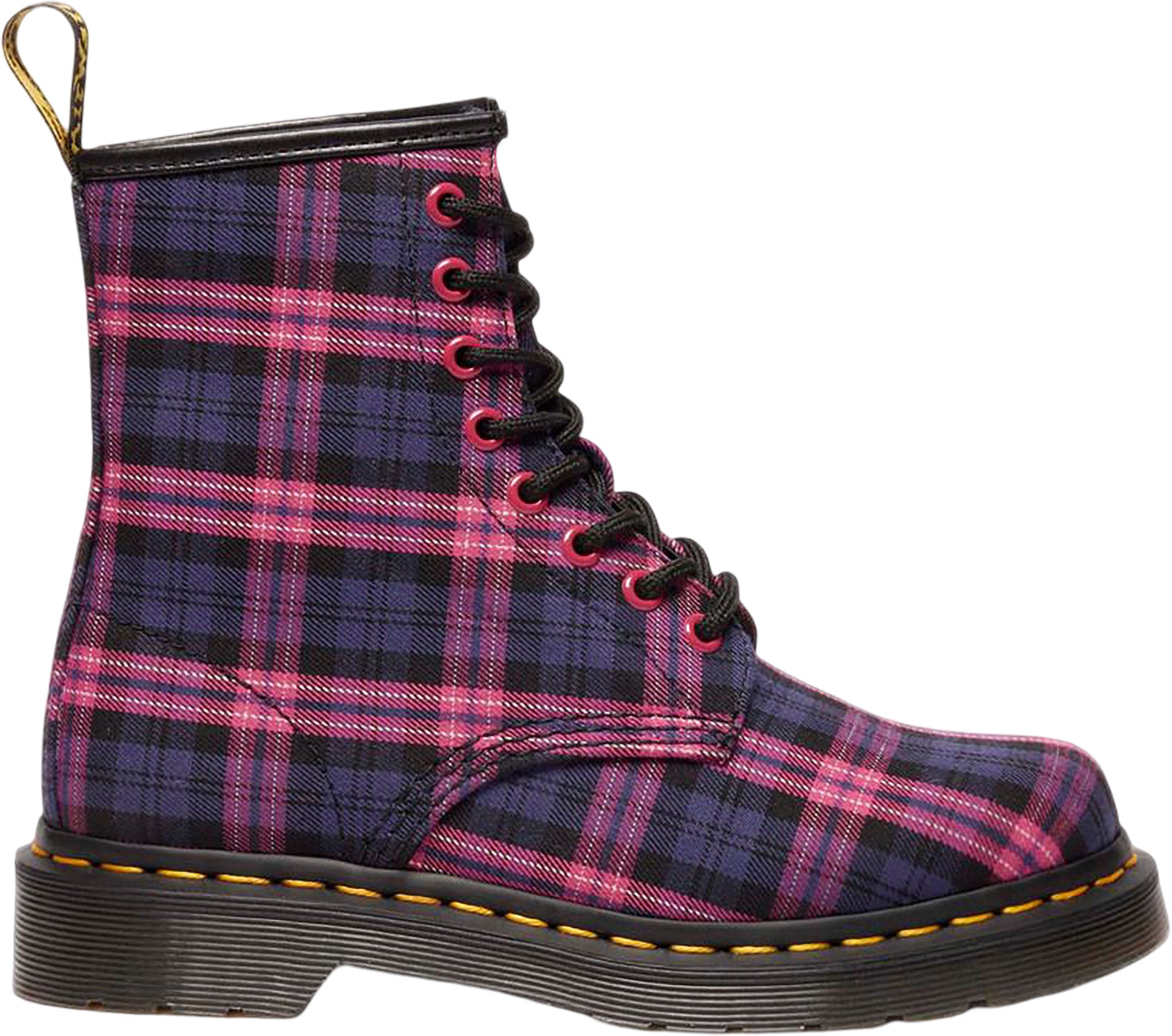 Nothing plain about plaid. This rework of our 1460 8-eye boot boasts an eye-catching all-over tartan design-complete with matching pink eyelets. The boot’s woven upper is also tagged with our unmistakable black and yellow heel loop. The air-cushioned DMS sole is marked with our signature grooving pattern and secured with yellow welt stitching-plus our unique undersole tread.