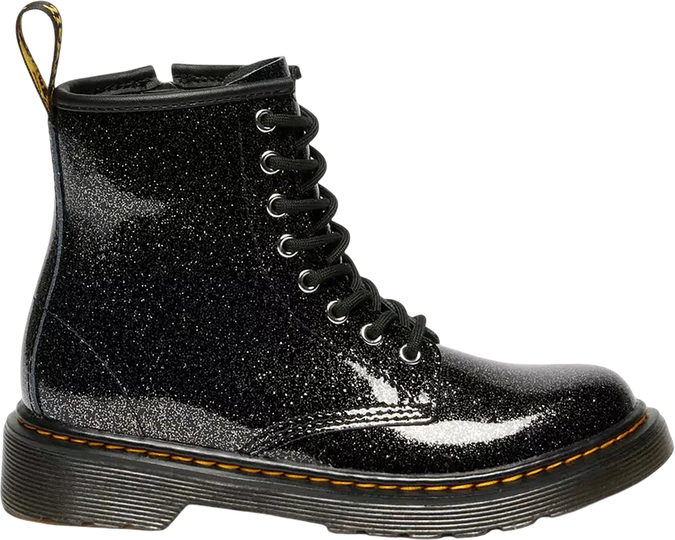The original DM’s boot-glittered for tiny feet. This revamped design is built for personalities that shine early on. Using Nebula Glitter, a classic patent leather with a high-shine finish and a sparkle effect. The silhouette has all the signature 1460 8-eye boot features you’d expect: A scripted heel loop and yellow faux welt stitching. Along with shiny silver eyelets, an inside zip and a cemented smoke DMS Kids sole.