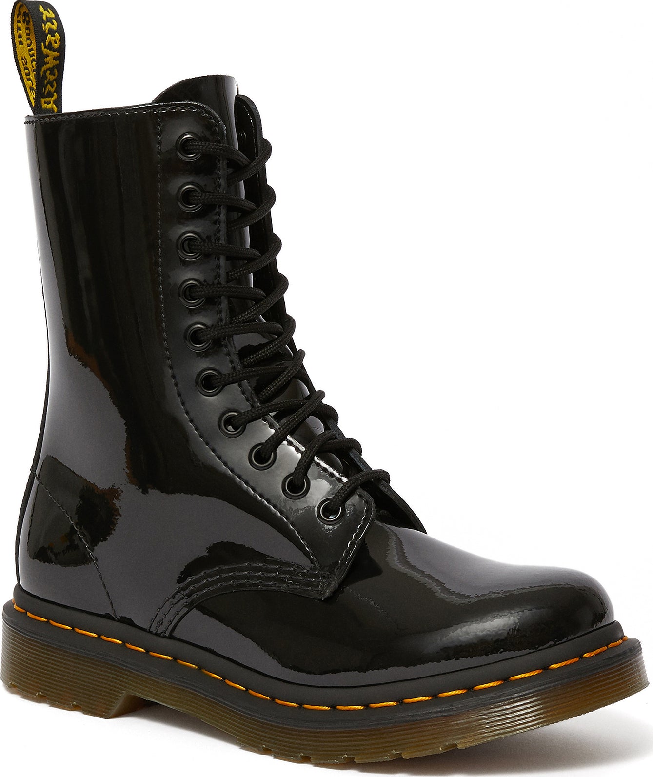 The Women’s 1490 PATENT LAMPER Boot from Dr. Martens was born in the early 70s and adopted by rebellious subcultures that wanted a unique style. This high boot worn by goths, punks and rebels features classic Dr. Martens detailing like the scripted heel-loop and yellow welt stitching. The boot has 10-eye fastening and the traditional Dr. Martens AirWair cushioned sole for all-day comfort. The hardwearing leather upper is polished with a black sheen for a classic look that stands out.