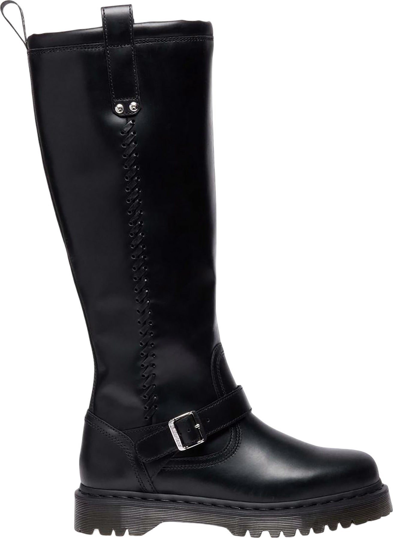 Taller, smoother and just as rugged. The Anistone Knee High biker boot has a more refined look but doesn’t forget its roots. Renewed in Orleans leather which has a polished finish. We added more height but stayed true to all of the fan favourite Anistone features: Silver hardware in the form of a brass buckle and cross rivet branding. And whipstitch detailing that cascades down the boot. Along with signature DM’s finishes, including our scripted heel loop and yellow welt stitching. The silhouette stands on a smoke Bex sole for extra height.