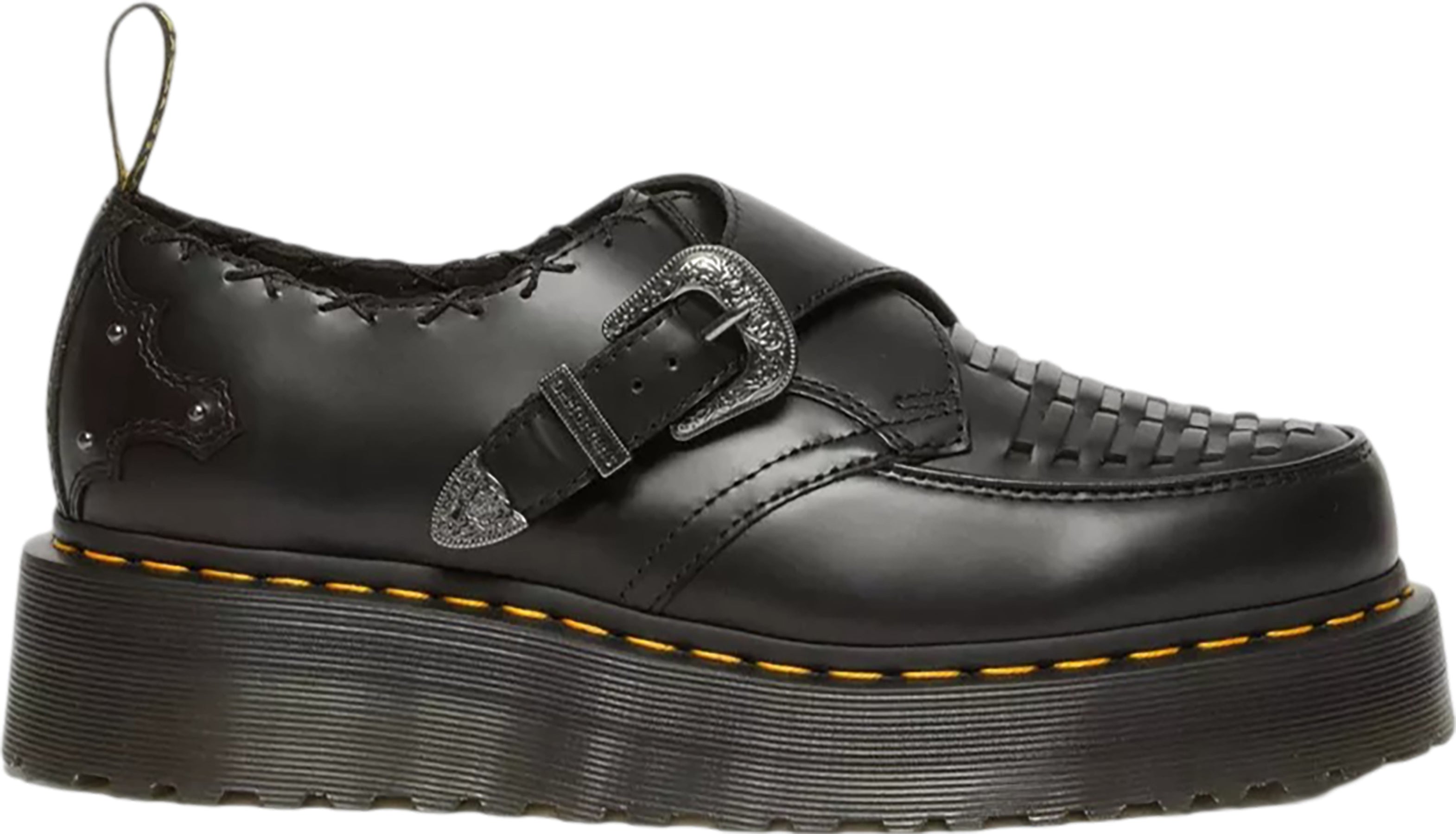 Long adopted by experimental subcultures from Teddy Boys to punks, the creeper has been part of Doc's history for decades. This detail-packed rework of our Ramsey creeper is stacked on an unmissable Quad wedge sole and built with Smooth leather. The creeper has classic weave detailing on the vamp and is fitted with a traditional Monk strap secured with an archive-inspired buckle. The upper is marked with stitch detailing and gunmetal studs. The creeper is tagged with our black and yellow heel loop and punched with signature yellow welt stitching.
