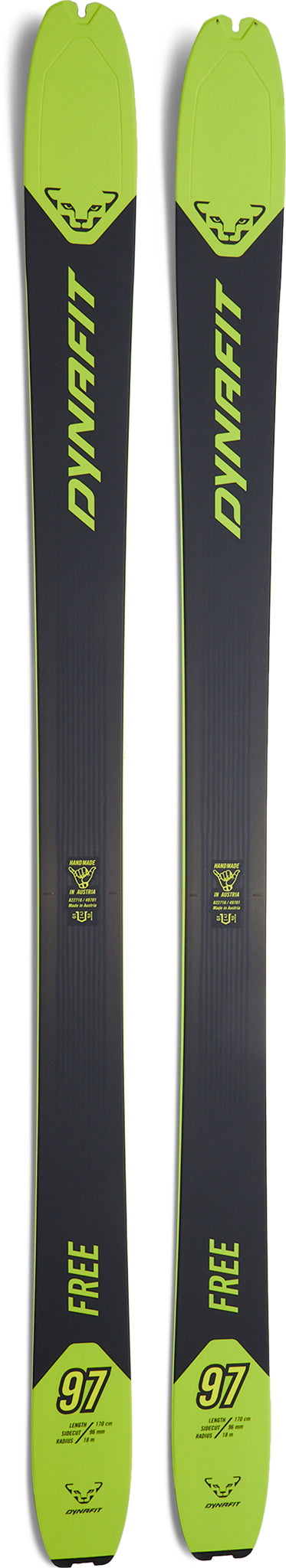 Playful, nimble and still stable, too-the new Free 97 touring skis for men make the pulse of freeskiers race. It magically creates the purest skiing fun in diverse conditions. Their light construction with 100% poplar wood core and the time-tested Dynafit carbon speed stringers allows you to save your energy on the climb so you can give it your all on the descent. A modern sidecut and the newly developed rocker at the tip and tail together with a balanced flex for optimum performance characteristics transform these skis into the perfect companion for untouched powder, steep couloirs, and diverse descents. Even in demanding ski conditions or when wearing a heavy backpack, you maintain full control and execute perfect ski turns. The slightly raised tip lends improved turn initiation and easy float. The full sidewalls guarantee direct power transfer to the edges for best performance and stability on both soft snow and hardpack. Free 97-for unforgettable powder turns.