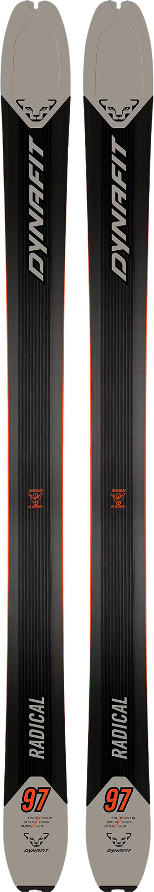 Playful, nimble and yet very stable-The new Radical 97 touring ski for men makes the hearts of descent-oriented touring enthusiasts beat faster. It provides pure ski fun in the snow in all kinds of conditions. Its light construction with 100% poplar wood core and the time-tested Dynafit carbon speed stringers allow you to save your energy on the climb so you can give it your all on the descent. A modern sidecut and the newly developed rocker at the tip and tail together with a balanced flex for optimum performance characteristics transform this ski into the perfect companion for untouched powder, steep couloirs, and diverse descents. Even in demanding ski conditions or when wearing a heavy backpack, you maintain full control and execute perfect ski turns. The slightly raised tip lends improved turn initiation and easy float. The full sidewalls guarantee direct power transfer to the edges for best performance and stability on both soft snow and hardpack. Radical 97-for unforgettable powder and downhill fun.