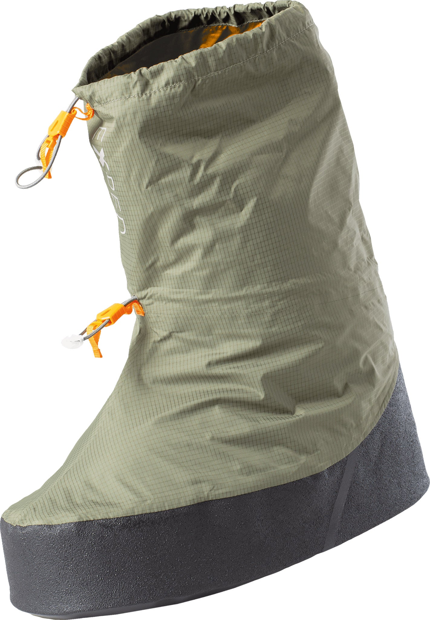 Waterproof overshoe for all Exped Camp Booties, Down Socks und Camp Slipper! The ultimate overshoe for basecamp, winter camping or just walking around camp in the woods. The durable sole is made of environmentally friendly TPU material and pulled up high around the sides as protection against ice, sharp edges and twigs. The padded heel is made of the same durable EVA foam of the inner sole and insulates when legs are stretched out on cold ground. Two adjustable elastic cords can be handled easily even with gloves to cinch the Bivy Booty tight. All seams are factory taped and the 3 layer outer shell(Exped VentAir®)is highly vapor permeable.
