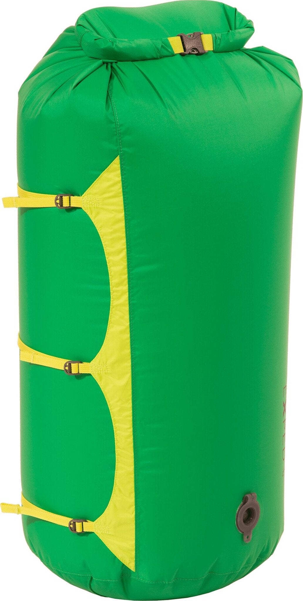 Waterproof compression bag with purge valve and horizontal compression straps. Use this lightweight bag to easily and quickly compress sleeping bags or clothing.