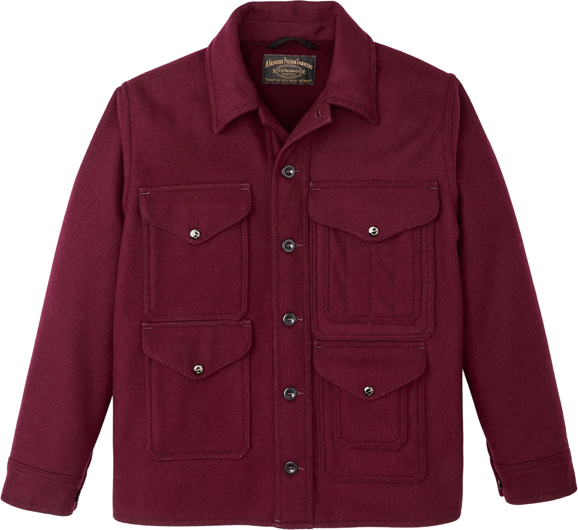 Made at Filson, Seattle. This special release revives a Mackinaw Wool Cruiser from Filson’s archive. The fit, bevel-cut pockets, and enameled snaps are based on a 1948 jacket. The Mackinaw Wool Cruiser was patented in 1914 for men working long days surveying timber stands in Pacific Northwest forests. Built from dense Mackinaw Wool, it blocks wind, sheds snow, and stays warm even when wet. The Cruiser has been a trusted favorite for over a century because the design just plain works. As it has evolved, changes have been subtle. Each of the four front cargo pockets are individually cut and sewn, with beveled corners. Those on the left side are oversized and vertically offset. This unique configuration was purpose-built for carrying tools and notepads varying in size. Smaller utility pockets are overlayed, originally designed for carrying a compass, pens, tools, or a pipe. Like the original, the snap-flap cargo pockets are single-entry from the top. The full-width, reach-through back pocket was designed for survey maps and charts, and just as useful today for gloves or other bulky items.