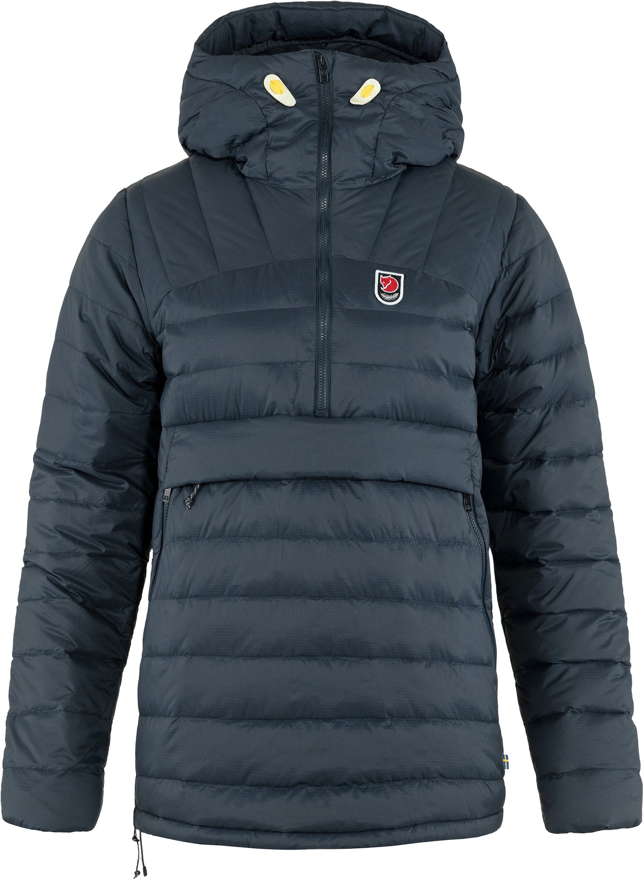 Light and packable down anorak for winter activities. Perfect as a reinforcement layer on top of or under a shell jacket, and its slightly looser fit plus a side zipper makes putting on/taking off easy. Padded with one layer of ethically produced down in stitch-through channels, synthetic insulation over elbows for extra insulation and shoulders for extra resistance against pressure and moisture. Two hand pockets and one kangaroo pocket, all with zippers. Part of Fjällräven’s Expedition Series with iconic designs, sustainably produced materials and high reliability in cold conditions.