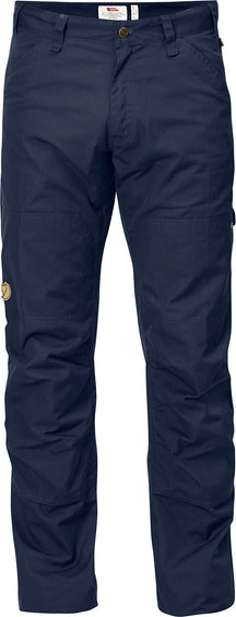 The men's Barents Pro Jeans are a simple trekking pant, designed for those wanting a high level of functionality and durability. These trousers are made from hard-wearing G-1000 Original fabric, which is double layered on the front of the thighs and knees. The knees also have openings designed specifically for accessory kneepads. Fjällräven built the Barents Pro Jeans in a pre-shaped cut and equipped them with a simple pocket design that includes only hand and back pockets, along with a small side pocket for a multi-tool. The Barents come in a regular fit with a mid-waist and have leg endings that can easily be adjusted. A loop along the waist serves as an ideal location to store a knife or gloves.