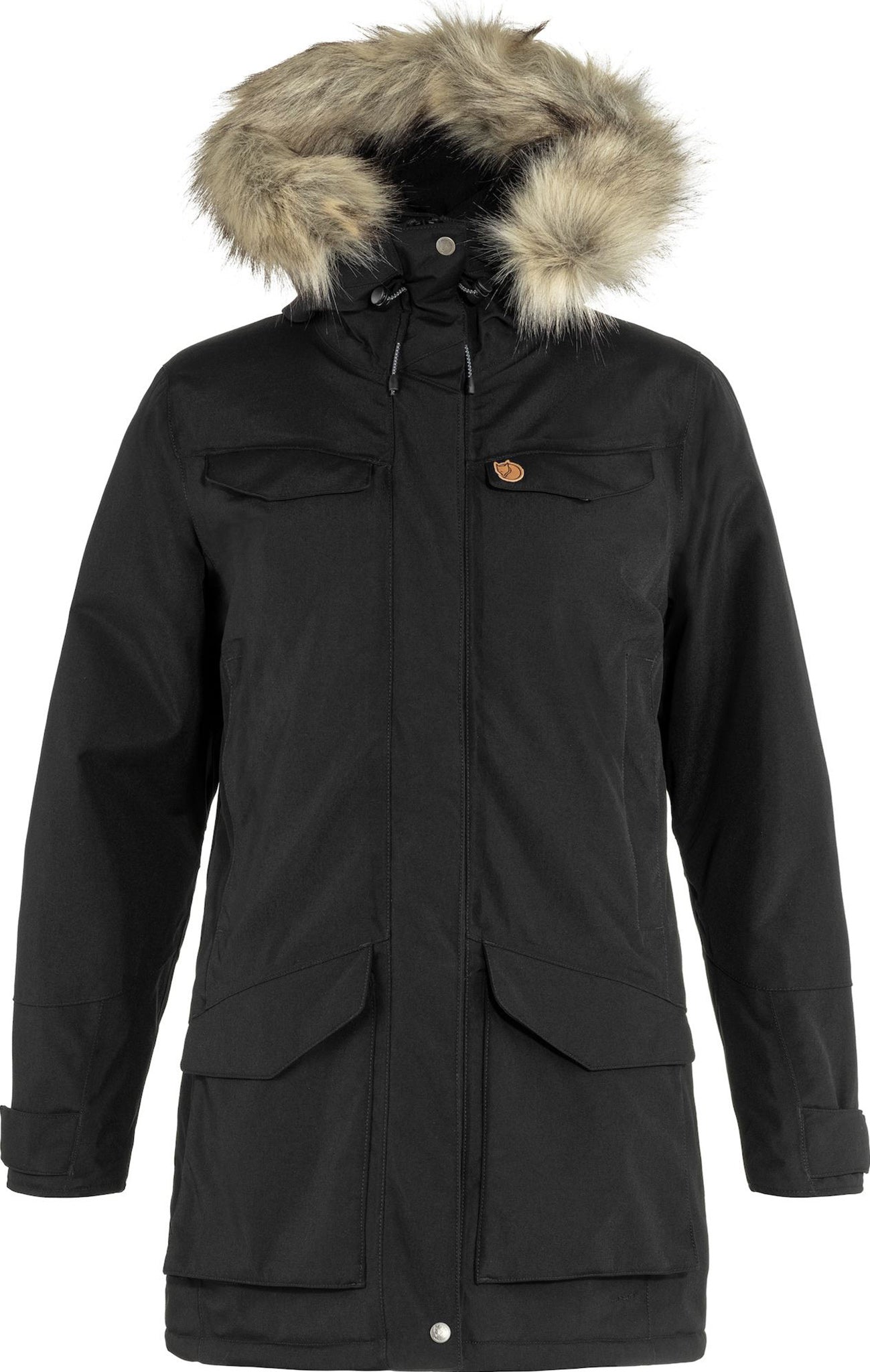 Long, generous parka that reaches down over the rear and thighs. A perfect choice for changeable weather conditions; it protects against the wind and rain, and the synthetic padding will keep you warm in really cold temperatures. Fleece-lined storm hood with metal wire, protective brim and detachable faux fur edging. Eight pockets with plenty of room for essential items. Drawcord at the waist and two-way zipper with protective flap. This is an updated version of Fjällräven’s classic parka, now with sustainable fabrics and improved features and fit.