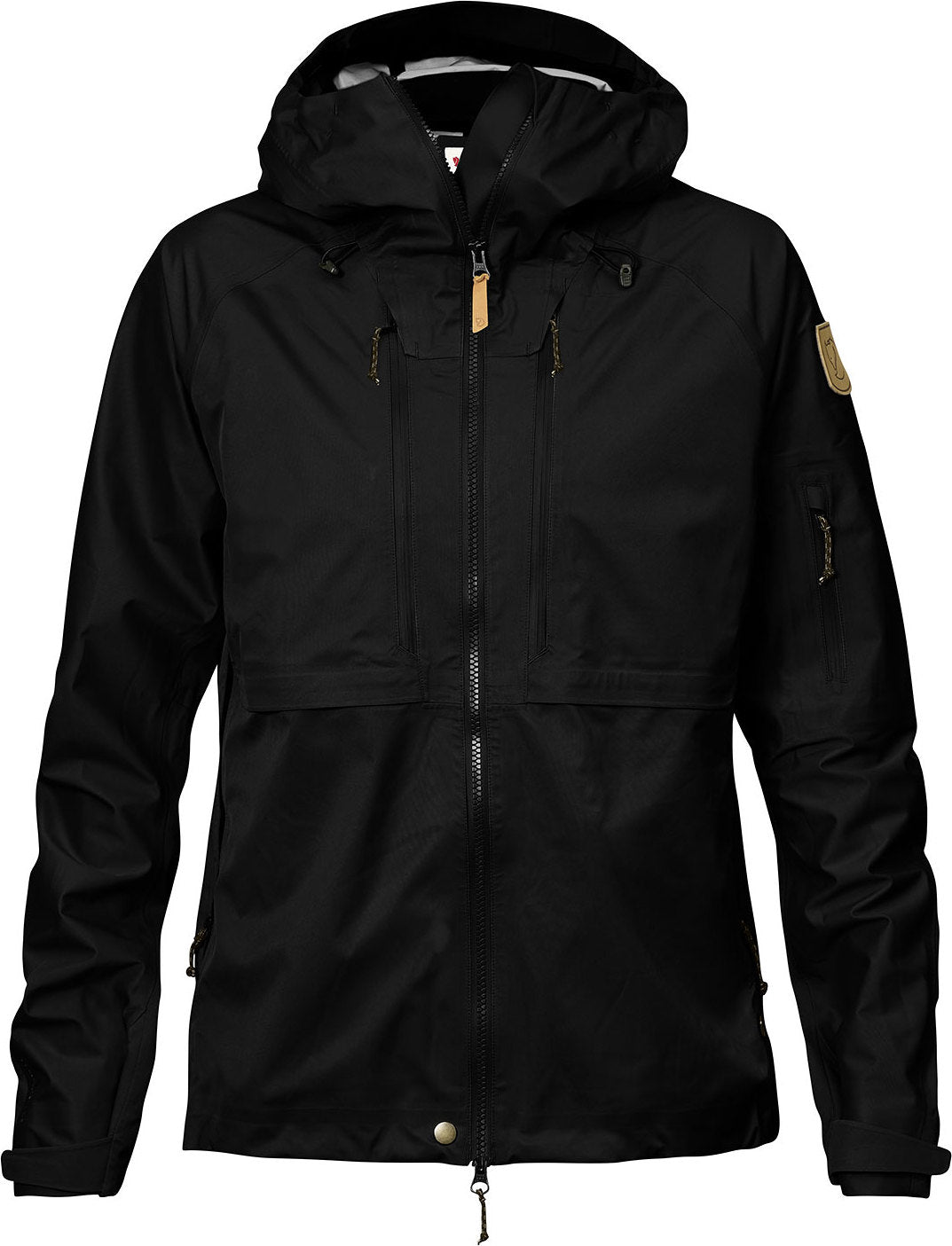 Fjällräven outfitted the Keb Eco-Shell jacket with a well-fitting hood, which can be worn over your helmet and can be adjusted for optimal peripheral vision. The two-way front zipper allows for easy ventilation and has a protective flap on the inside. The chest pockets were designed to be accessible when wearing a pack or harness, and have hidden bellows and elastic mesh inner pockets for your phone and other essentials. Side zippers allow for the release of excess heat. The sleeve cuffs secure with Velcro and the hem is drawcord adjustable