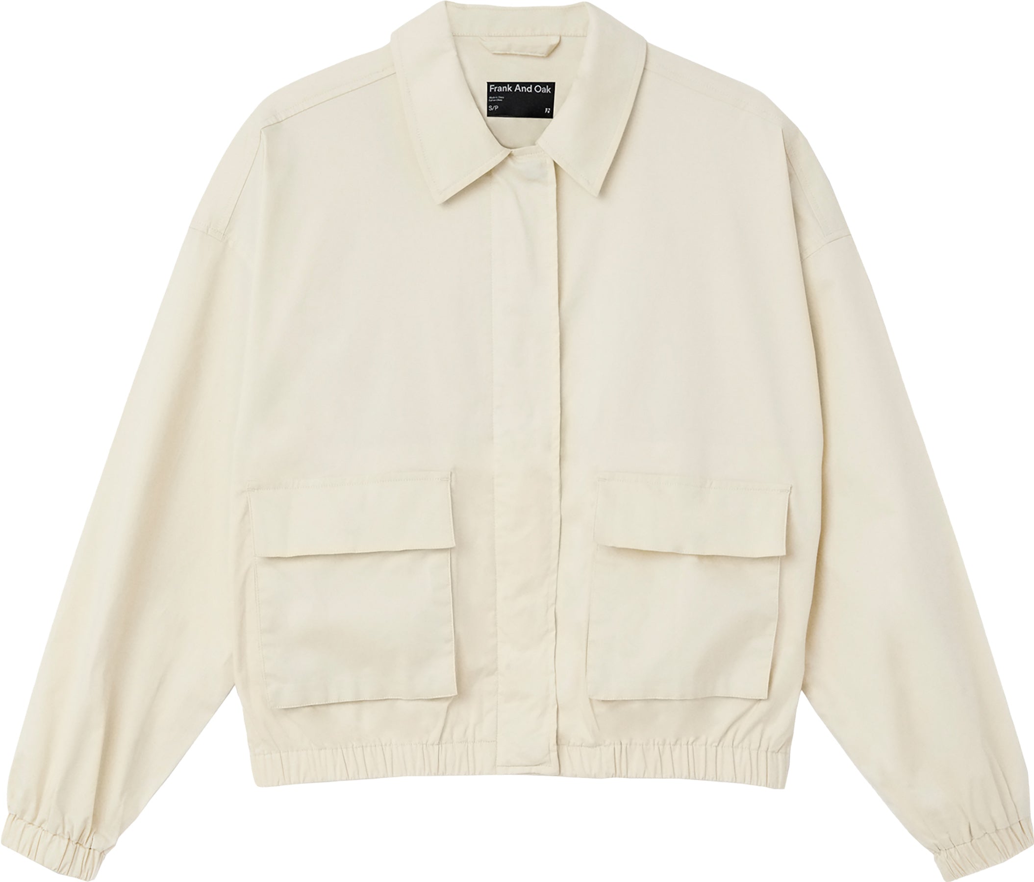 Your new favourite bomber jacket. Made with lightweight organic cotton twill and a bit of stretch for easier moves. Loose fit. Dropped shoulders. Features an elastic at the hem and cuffs to accentuate the bubbled-shaped silhouette. Patch pockets with flaps at front. Point collar. Zipper front closure with a flap. Hidden snap buttons. Unlined. Pair with its matching parachute pieces.