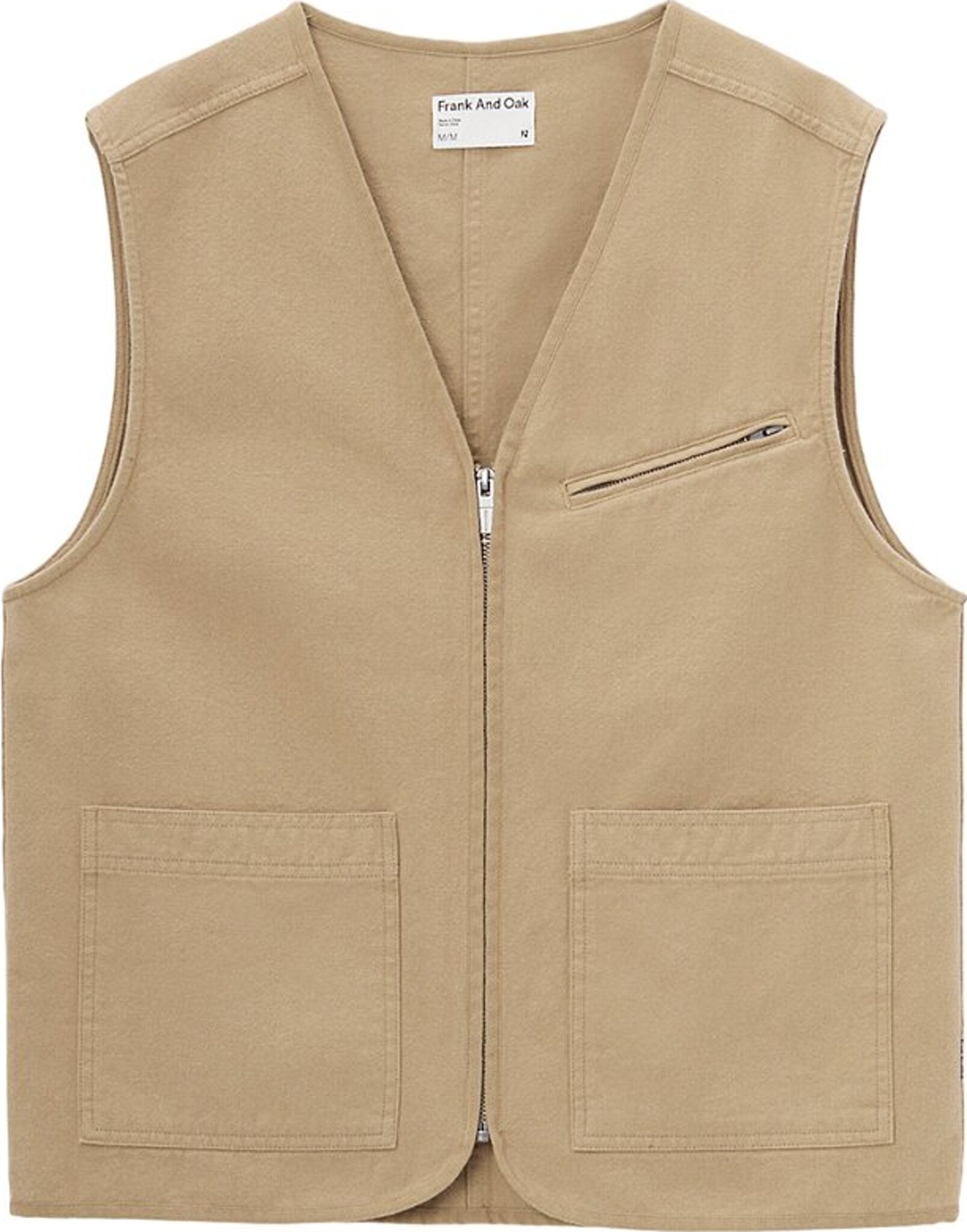 A utility-inspired style made from sturdy organic cotton canvas. Regular fit. Sleeveless. Zip closure. Zip pocket at the chest. Large patch pockets.