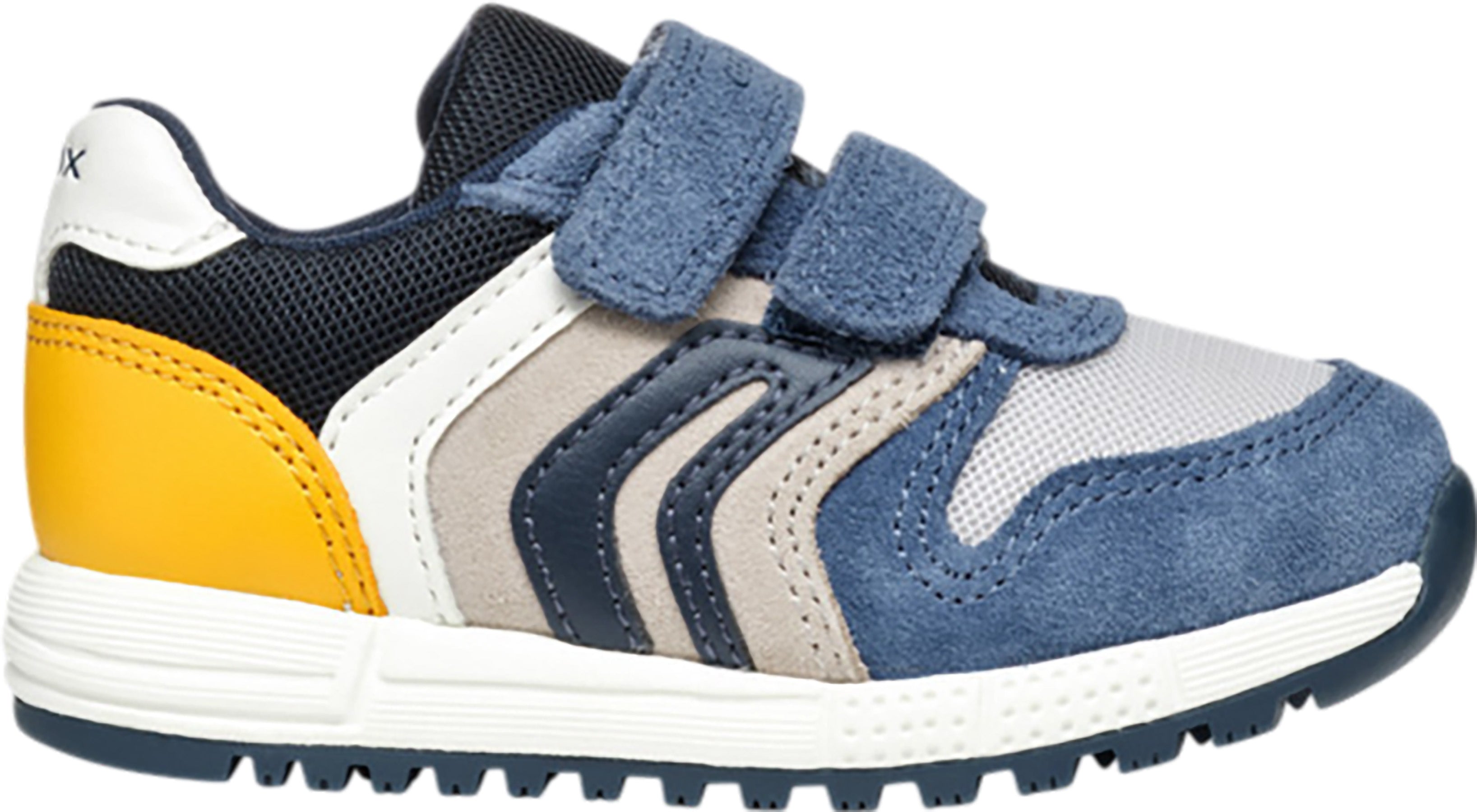 Breathable casual-looking sneaker for babies with a stylish retro-running-shoe aesthetic. Alben boasts a supple upper made of suede and mesh in a combination of light and navy blue. Easy to pull on and adjust with a practical double hook-and-loop closure, it ensures an exceptionally stable gait and high levels of safety for everyday adventures.