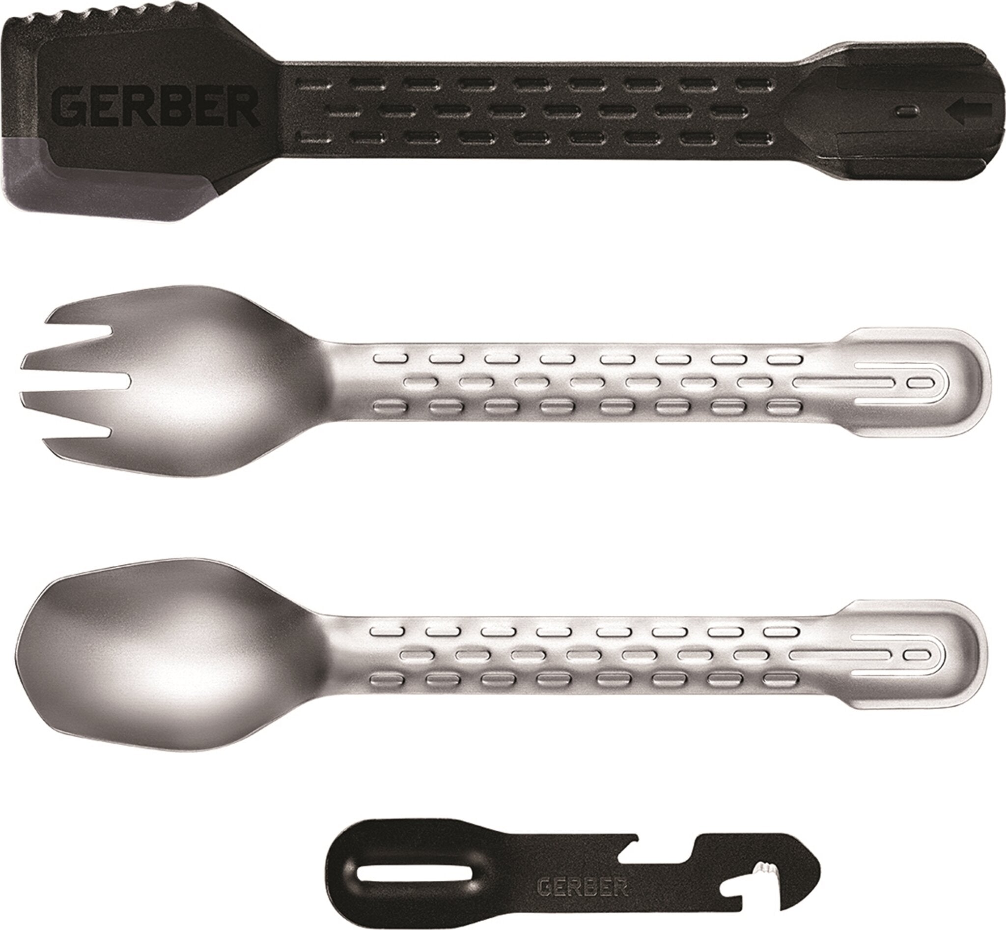 Features • Spatula (serrated & silicone edge) • High temp nylon with silicone overmold • Long tine fork • Deep basin spoon • Tongs (fork or spoon + spatula) • Multi-tool components: Bottle opener, Veggie peeler, Serrated package opener, Can opener