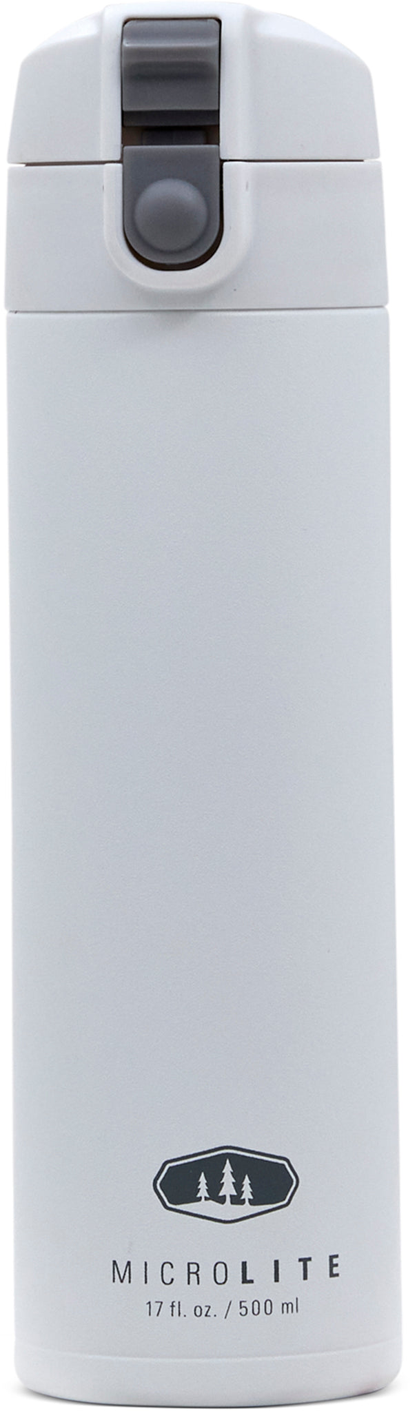 Stainless steel makes it rugged and pure, and the insanely thin 2mm walls keep the profile trim enough for cupholders and other tight spaces. The cap is amazing. Lock it tight for travel, then push a button and it flips up for easy drinking.
