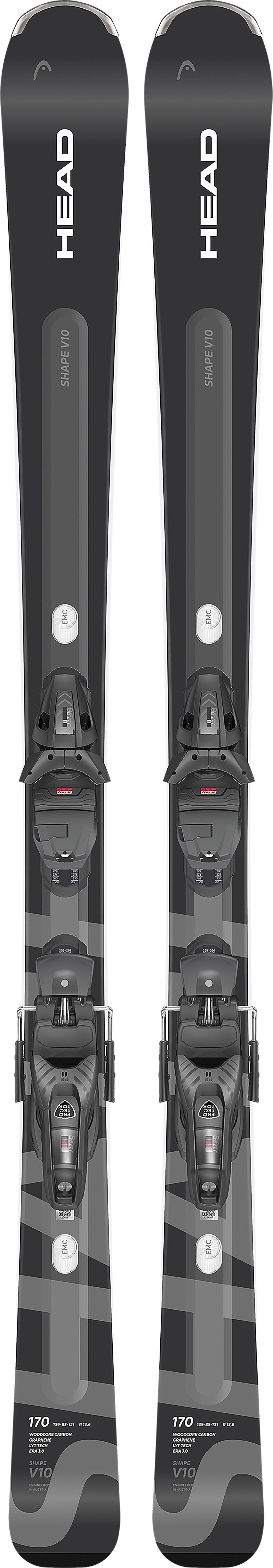 The new Shape e-V10 features top technology and a user-friendly geometry that suits all-mountain skiers. A wide tip and tail, an 85-mm waist and Head's rocker-enhancing ERA 3.0 support quick turn initiation, reliable edge hold and soft snow performance. EMC, or Energy Management Circuit, reduces vibrations, while a Tech Backbone in the wood core reduces unnecessary weight and increases hard snow performance.
