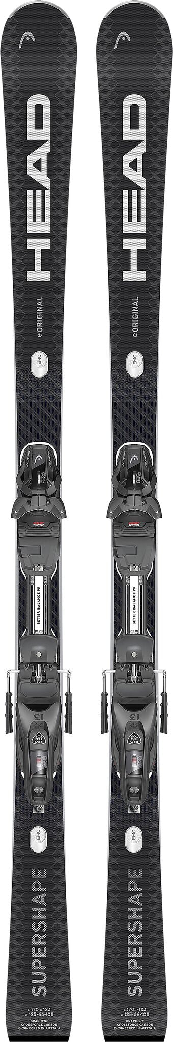 Born from slalom race skis, but designed for recreational skiers, the Supershape e-Original is a perfectly-balance, short-turn loving ski with an entirely new shape and construction. The new design results in better power transmission of forces onto the snow thanks to the slim 66mm waist and Head's Crossforce-Carbon construction, which includes the metal-reinforced sandwich layup of a World Cup ski. EMC technology reduces vibration and increases stability for a smooth ride in tight turns, while the unique Better Balance system plate provides a constant ramp angle for all boot sizes, offering optimum balance for skiers.