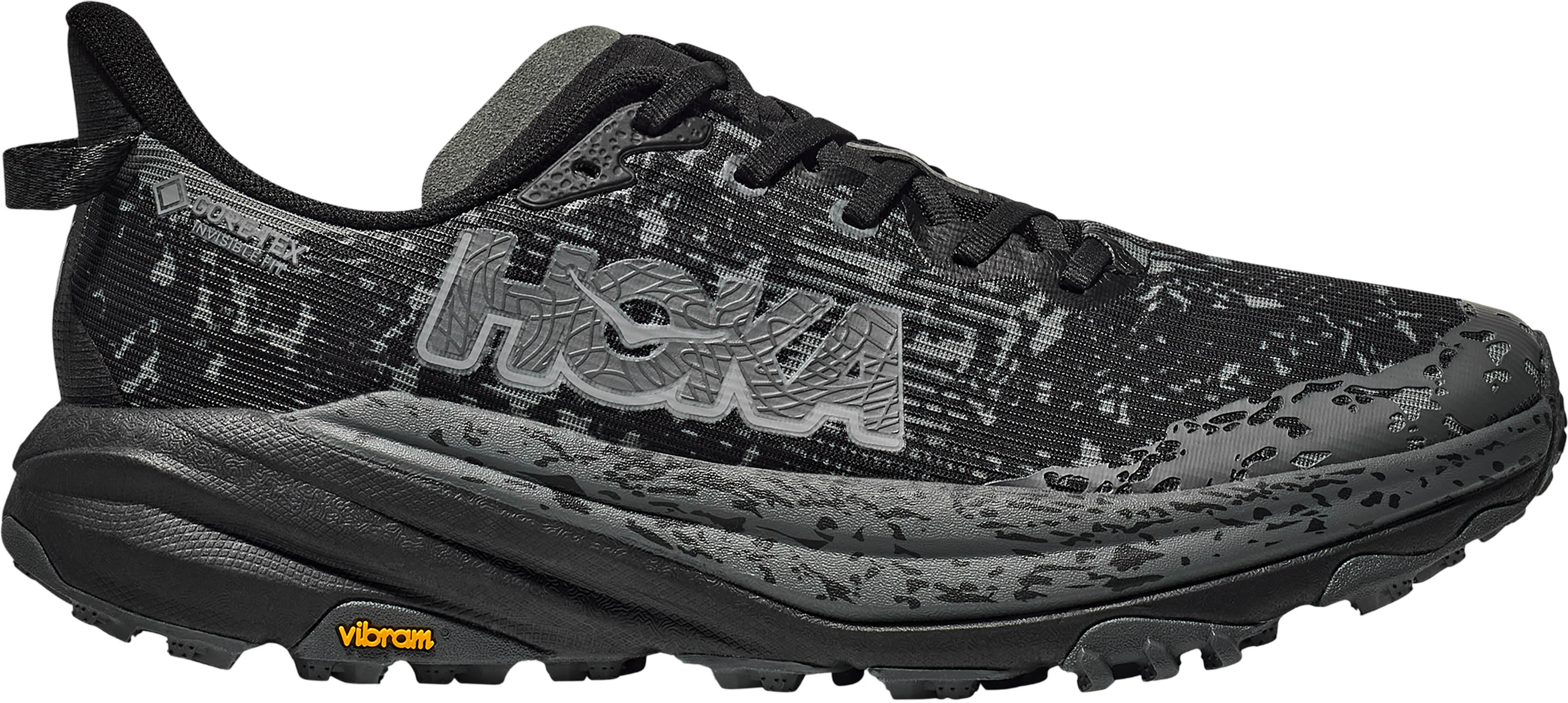 The Speedgoat 6 GTX is now even more comfortable with Gore-Tex's Invisible Fit waterproof membrane for a lighter, more flexible construction to help avoid pressure points. Grounded in a Vibram® Megagrip with Traction Lug outsole for increased bite on loose soil, this trail icon employs a foot-cradling heel bolster, lightweight, responsive midsole compound and a protective toe rand for charging through the rough stuff. Bring it, weather.
