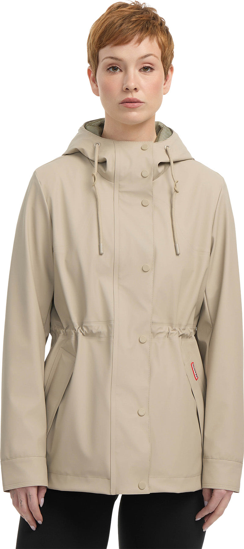 Level up your rainy-day style in the Abbey short, rubberized jacket. Featuring wielding seam construction to repel water, a breathable design, a permanent hood, and adjustable waist, this stylish provides ultimate protection against wet weather.