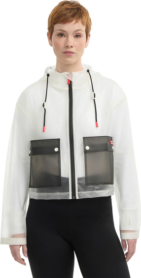 Experience the ultimate blend of style and functionality in the Jessie matte transparent cropped jacket. With a color block design, permanent hood, contrast patch pockets, and red Hunter signature accent details, it will elevate any look.