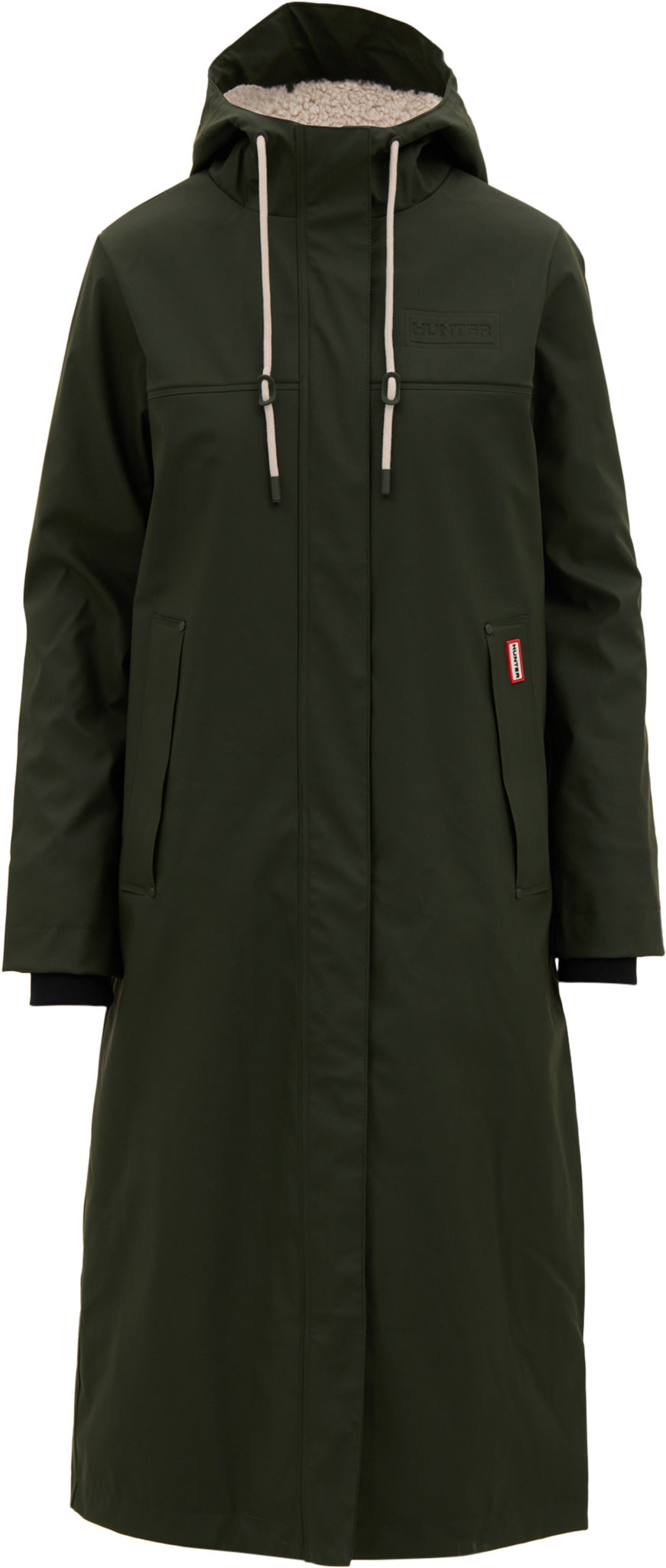 The Sammy longline padded rubberized coat from Hunter is designed with a permanent and adjustable hood, two welt pockets, and a back shield with a hidden snap. It is partially lined with Sherpa, and has a water-resistant rubberized fabric bonded to a knit backing.