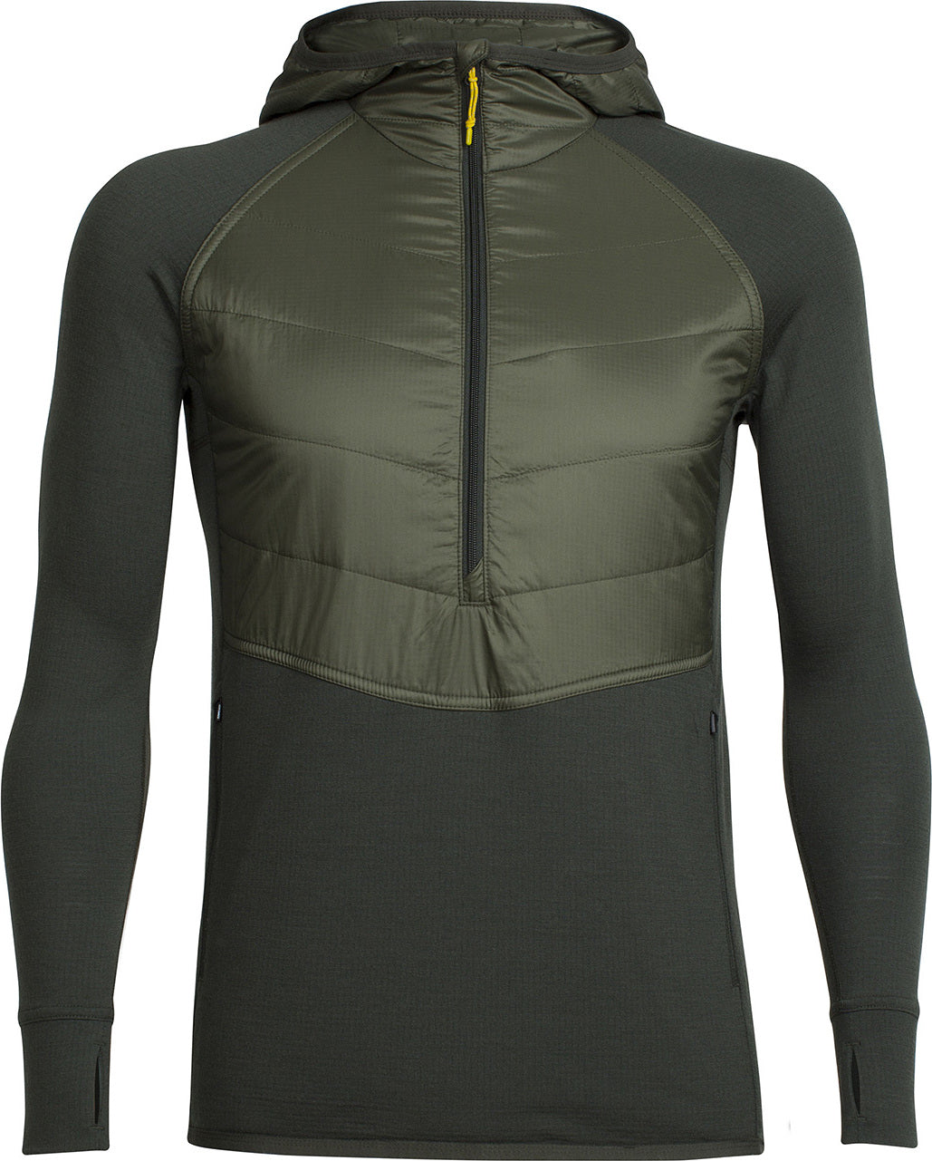 The men's Ellipse Long Sleeve Half Zip Hood is a highly technical alpine mid layer, built with eco-conscious insulation and loads of comfortable features. It has 70g of strategically zoned MerinoLOFT insulation mapped through the chest panels and hood, delivering breathable warmth as a natural alternative to synthetic fills. The body and arms are made of soft and quick-drying 230gm waffle fabric. This fabric blends merino wool with polyester to actively manage moisture and body temperature during chilly high-output activities. The recycled polyester face fabric covering is treated with a DWR finish. A snug fitting hood offers additional warmth and wind protection. This pullover's zip-neck collar provides fast venting. Behind the half zipper, there is an interior stormflap and a wind guard to prevent chafing.