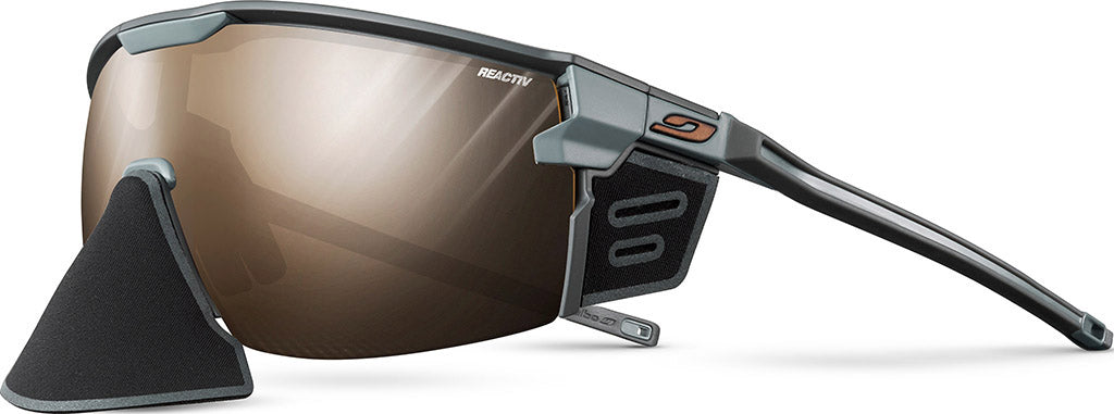 Ulbo reinvents mountain goggles with ultimate cover, combining high protection and ultra lightness. This model provides optimum protection for the eyes and face thanks to a nose guard and removable Spandex side shields that comfortably protect against sun, wind and cold. Its modular design can accompany the mountaineer from training in the valley to reaching the highest peaks. CustomFIT temples with precise and long-lasting adjustment, combined with a Grip Tech structure, produce a tailor-made grip and a lightweight spec. Fitted with a 3D Nose, the glasses offer flawless hold when you're working flat out, with or without a helmet. A panoramic lens creates an energetic style while giving you protection and visual comfort thanks to reactiv Photochromic lenses. Ultimate cover will help push your limits all the way to the top!