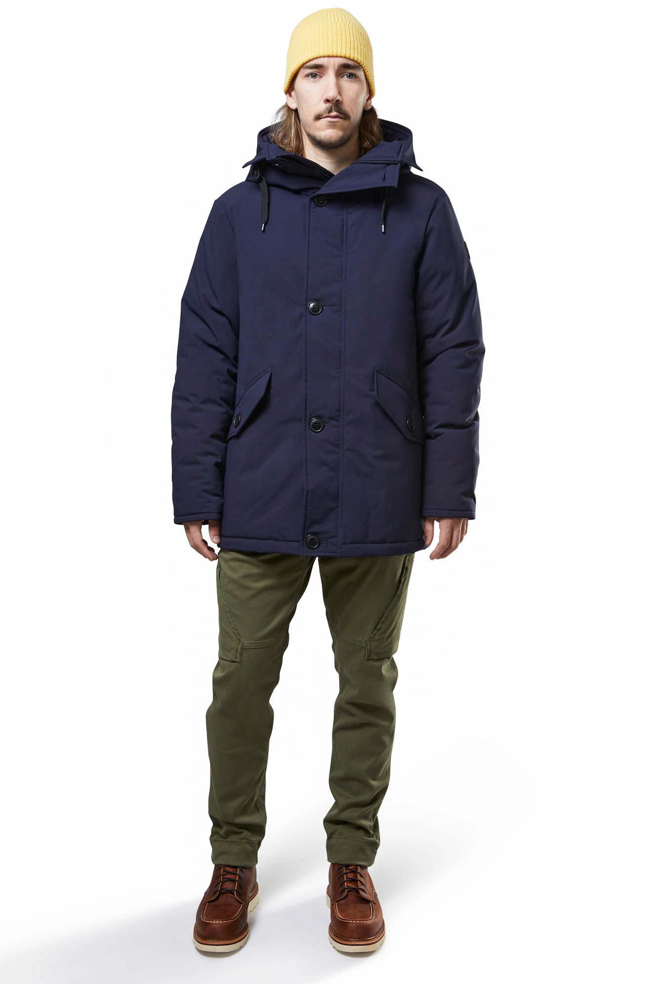 The Men's Brav Jacket's shell sheds snowflakes and droplets while protecting from the wind. An attached hood and soft insulated cuffs further seal out the elements, while buttons on the central and pocket flaps add a distinctive touch.