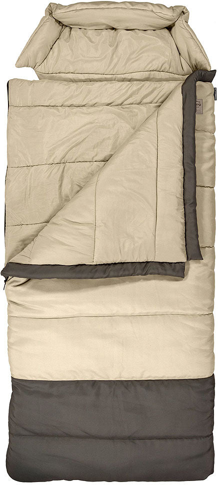 Features • Rectangular design allows plenty of room to stretch out • Rugged, canvas exterior with a soft-touch polyester liner • High loft insulation keeps you warm in below-freezing temperatures • Adjustable, detachable sleeping bag hood to customize your sleep experience • Drawstring shoulder baffle seals in warmth and eliminates a cold draft. • Zip together with a second sleeping bag to create room for two • Carry bag included