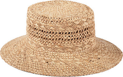 A straw bucket hat style with a structured boater crown and a domed wide brim. Made from 100% raffia straw, this bucket hat has an intricately hand-woven patterned design. A special piece worthy of special moments.