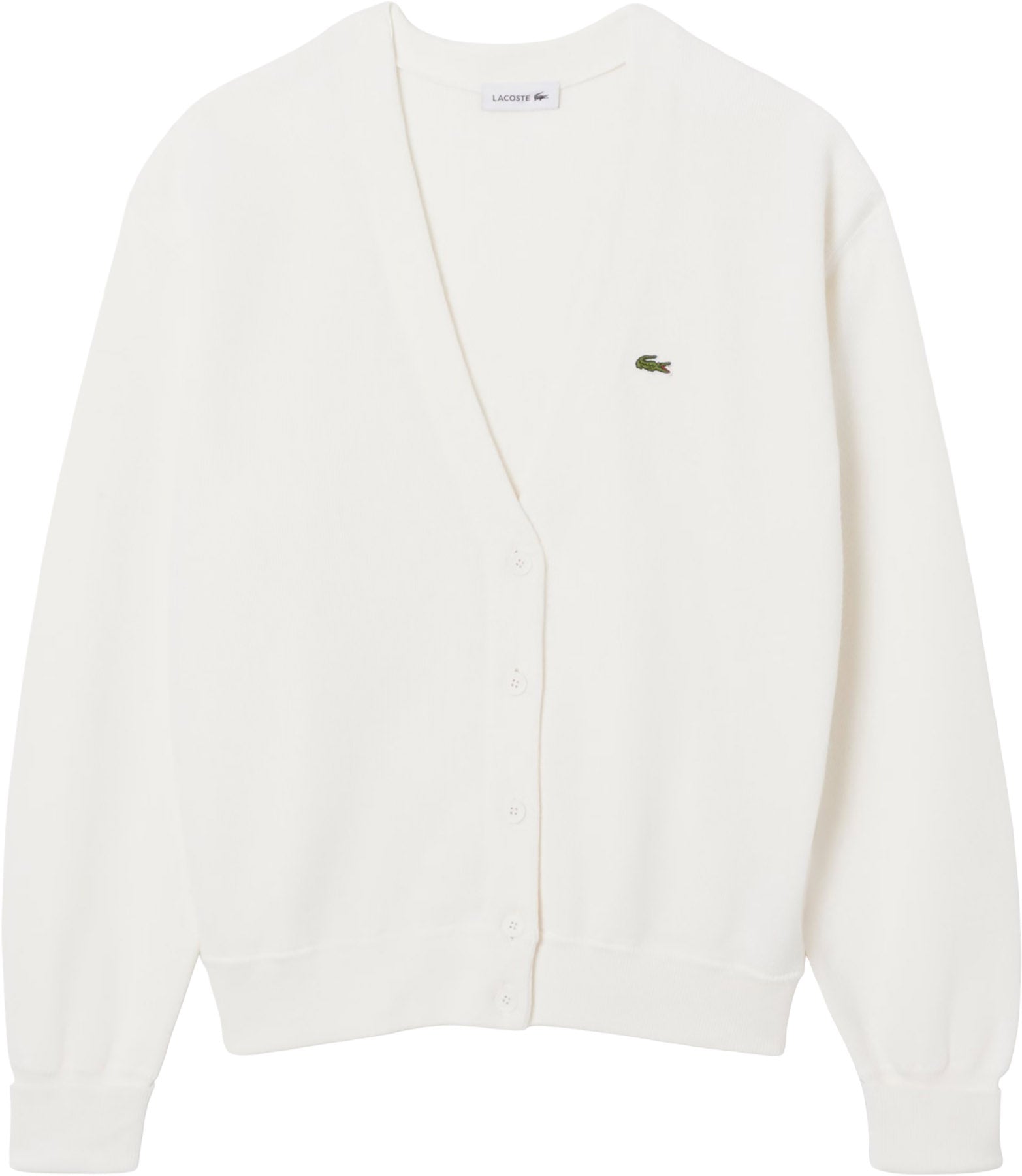 This V-neck cardigan showcases the best in Lacoste knitwear expertise, with an iconic moss stitch knit for a soft feel and retro looks. The short, loose cut and finishing details, including contrasting side seams and an embroidered crocodile, add a modern twist. A new Lacoste wardrobe essential.