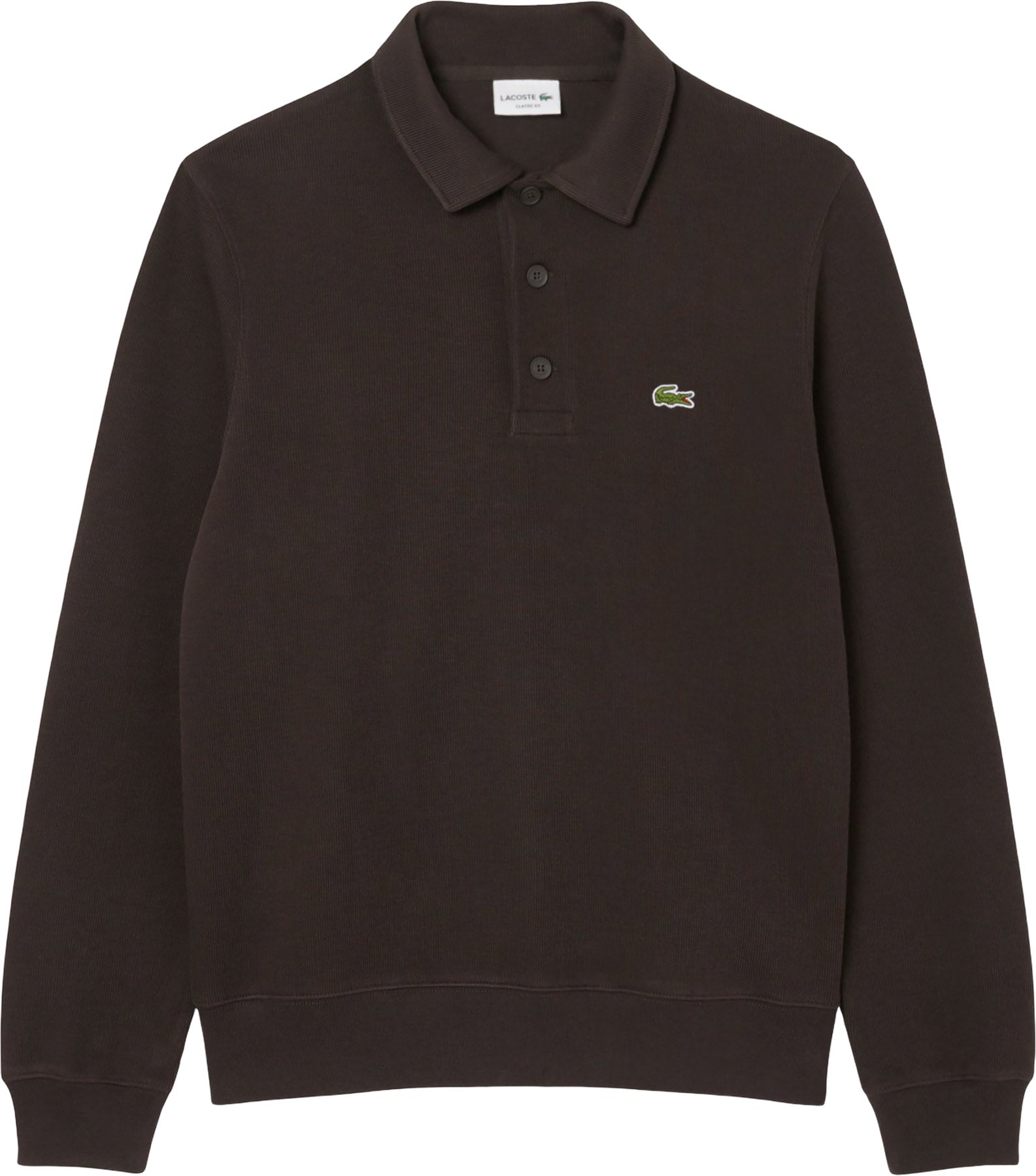 Color combinations and graphics for a Lacoste dynamic and creative identity Regular fit, natural ease on body Polo collar sweatshirt in ribbed interlock cotton with a button placket Ribbed at sleeves and bottom of garment Tone on tone buttons at the front button placket.