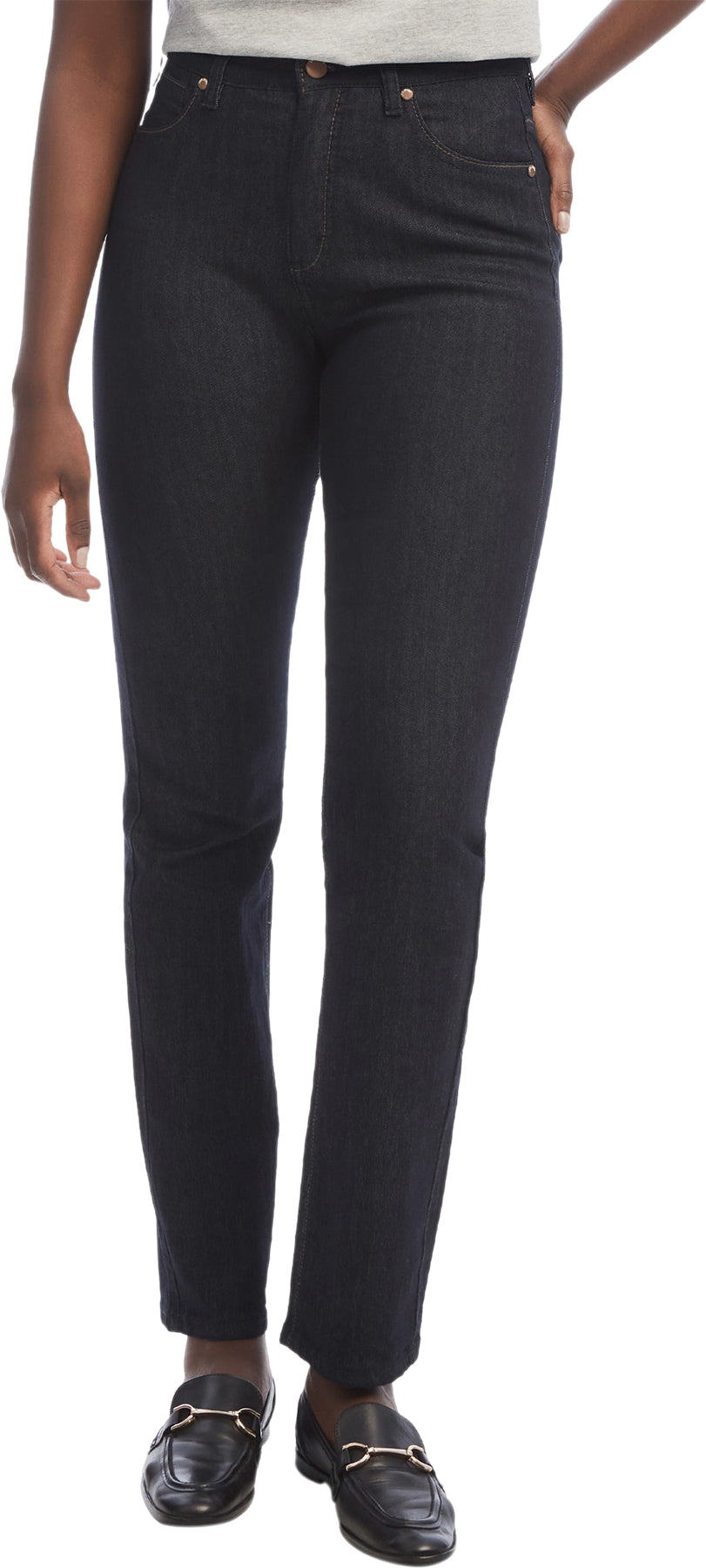 Features • Mid-high rise & curvy fit/straight leg • Front panel to smooth the stomach • Elastic waist • Easy care