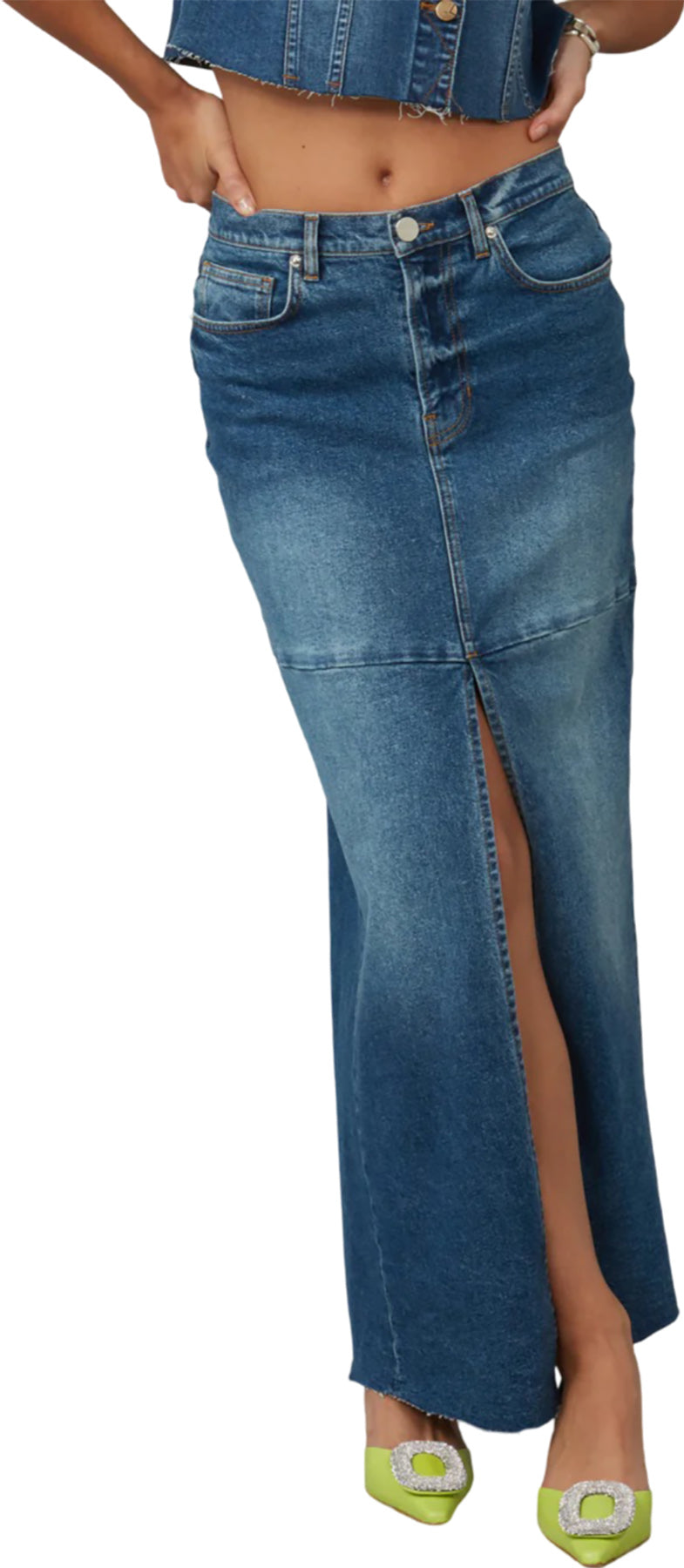 The Madlyn is the cool girl denim maxi skirt for SS24. Madlyn has a relaxed fit, front slit and raw hem. Featured in a new timeless wash, Twilight.