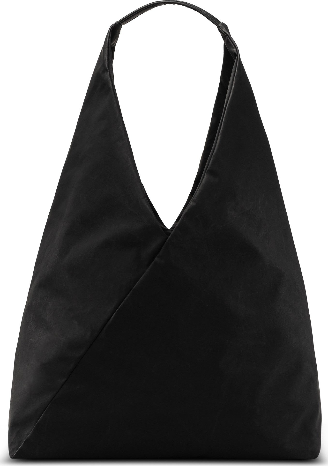 Made from Carbon fabric. Triangular shape. Logo embossed leather patch on handle. Snap to keep the bag closed. Inside, a zipped pocket, 2 compartments, and a leather cord with hook for your keys. Lined with our signature Piumi lining. 100% made in Montreal with imported raw materials.