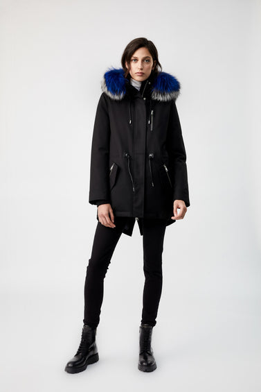 The women's CHARA Down Parka is a warm city winter coat with removable silver fox fur trim. 800+ nano fill power down insulation is at the warmest end of the scale, protected by a woven shell that's waterproof, windproof and breathable. The hood adjusts and you can remove the fur trim as desired. The centre front zipper closes with snaps on leather tape. Do up the waist tunnel with the drawcord and shut out the wind. Adjust the cuffs and nestle into the warmth of ribbed storm cuffs.