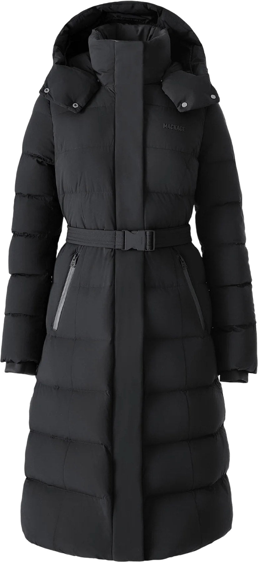 Coralia-City is a fitted, long down coat engineered for cold-weather protection without the bulk. Featuring a water-resistant zipper at the center front and pockets, this streamlined silhouette includes a hood with an adjustable storm visor, insulated interior, and storm cuffs. A removable belt with buckle allows for a customizable cinch at the waist, while the recycled down fill ensures superior warmth. Finished with Mackage silicone branding on the chest for signature appeal.